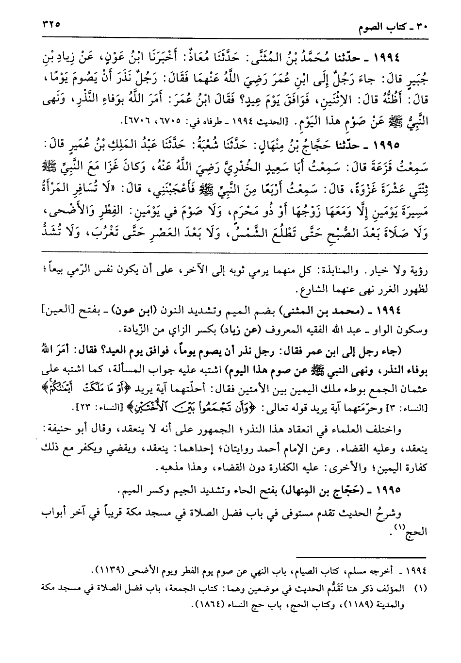 (جاء رجل إلى ابن عمر فقال: رجل نذر أن يصوم يومًا، فوافق يوم العيد؟ فقال: أمَرَ اللهُ بوفاء النذر، ونهى النَّبيُّ - صَلَّى الله عليه وسلم - عن صوم هذا اليوم) اشتبه عليه جواب المسألة، كما اشتبه على عثمان الجمع بوطء ملك اليمين بين الأمتين فقال: أحقتهما آية يريد {أَوْ مَا مَلَكَتْ أَيْمَانُكُمْ} [النساء: 3] وحرّمَتهما آية يريد قوله تعالى: {وَأَنْ تَجْمَعُوا بَيْنَ الْأُخْتَيْنِ} [النساء: 23].