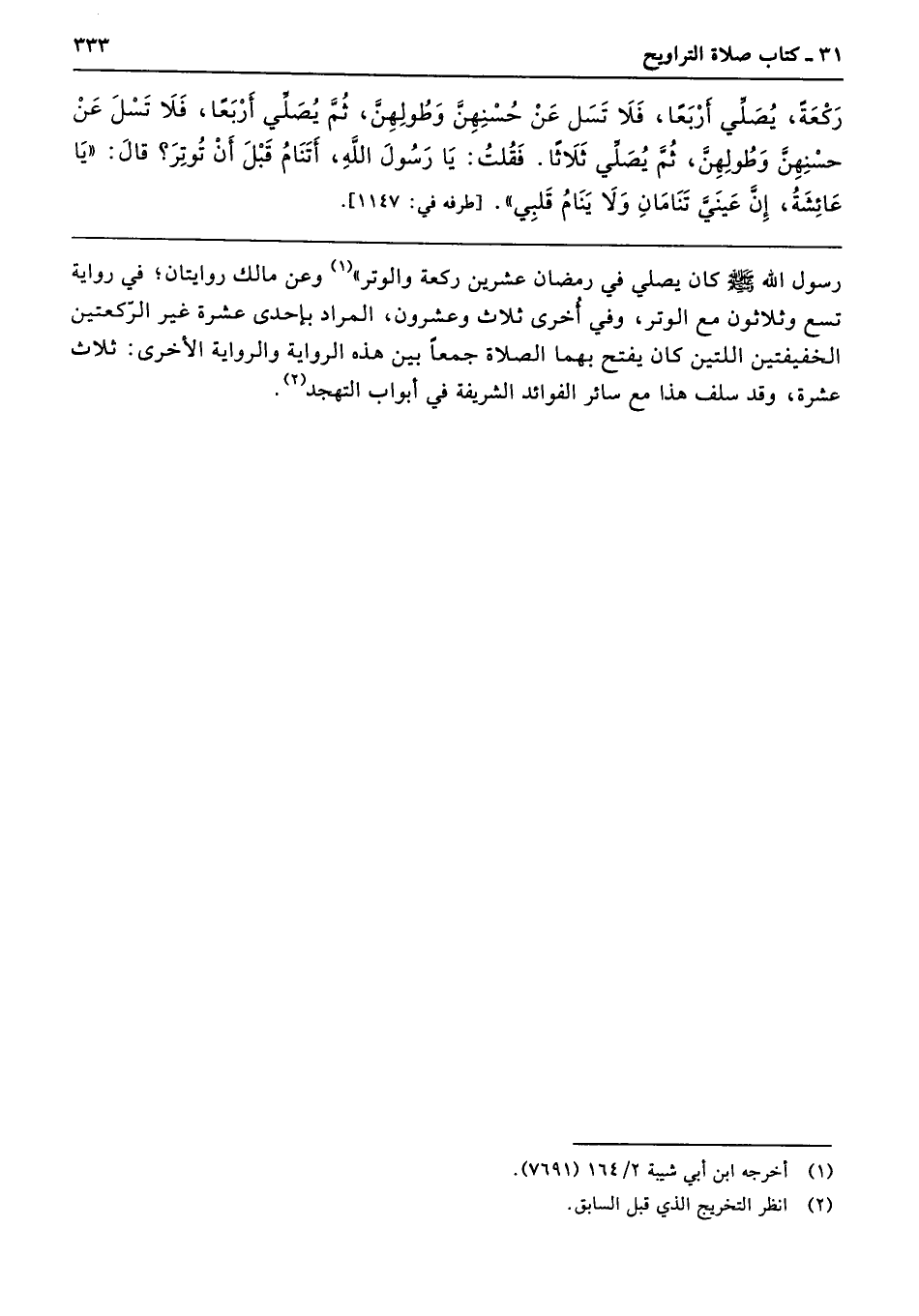 رسول الله - صلى الله عليه وسلم - كان يصلي في رمضان عشرين ركعة والوتر" وعن مالك روايتان؛ في رواية تسع وثلاثون مع الوتر، وفي أخرى ثلاث وعشرون، المراد بإحدى عشرة غير الرّكعتين الخفيفتين اللتين كان يفتح بهما الصلاة جمعًا بين هذه الرواية والرواية الأخرى: ثلاث عشرة، وقد سلف هذا مع سائر الفوائد الشريفة في أبواب التهجد.