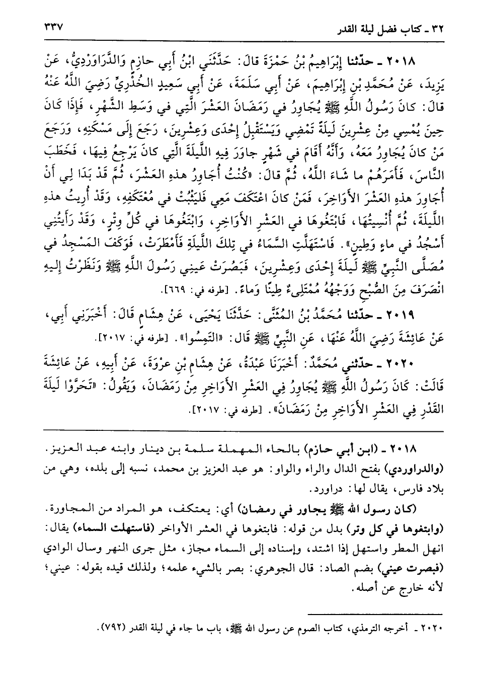 2020 - حَدَّثَنِى مُحَمَّدٌ أَخْبَرَنَا عَبْدَةُ عَنْ هِشَامِ بْنِ عُرْوَةَ عَنْ أَبِيهِ عَنْ عَائِشَةَ قَالَتْ كَانَ رَسُولُ اللَّهِ - صلى الله عليه وسلم - يُجَاوِرُ فِي الْعَشْرِ الأَوَاخِرِ مِنْ رَمَضَانَ، وَيَقُولُ «تَحَرَّوْا لَيْلَةَ الْقَدْرِ فِي الْعَشْرِ الأَوَاخِرِ مِنْ رَمَضَانَ». طرفه 2017