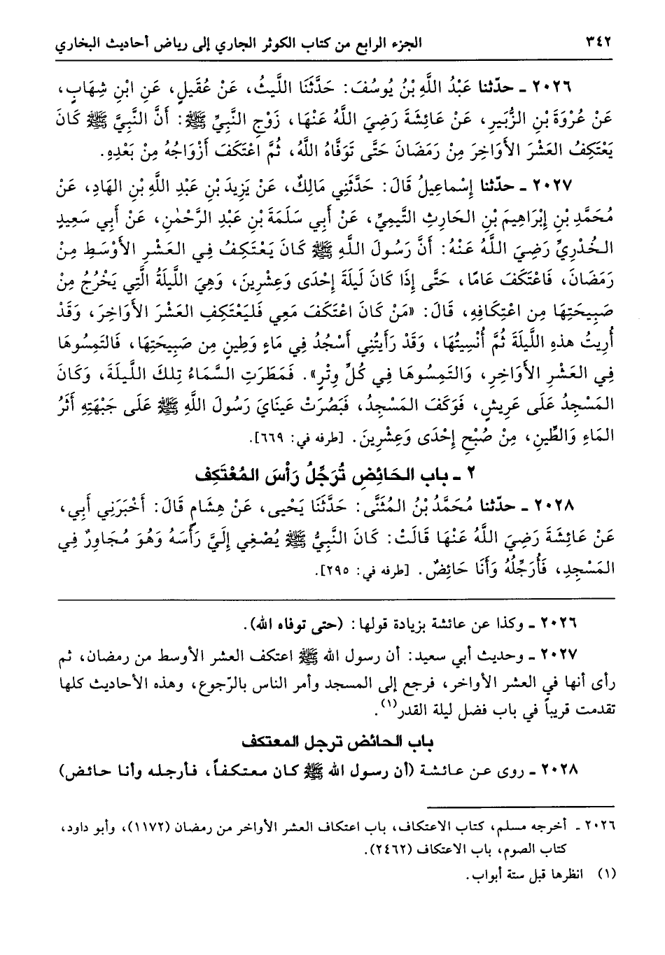 2028 - روى عن عائشة (أن رسول الله - صلى الله عليه وسلم - كان معتكفًا، فَأُرَجِّلُهُ وَأَنَا حَائِضٌ)