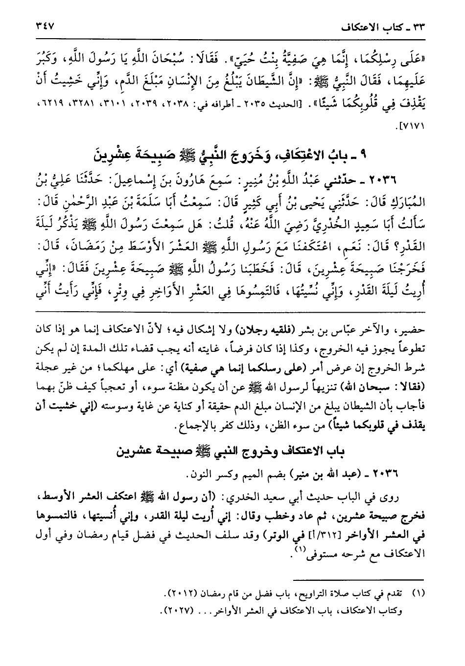 باب الاعتكاف وخروج النبي - صلى الله عليه وسلم - صبيحة عشرين