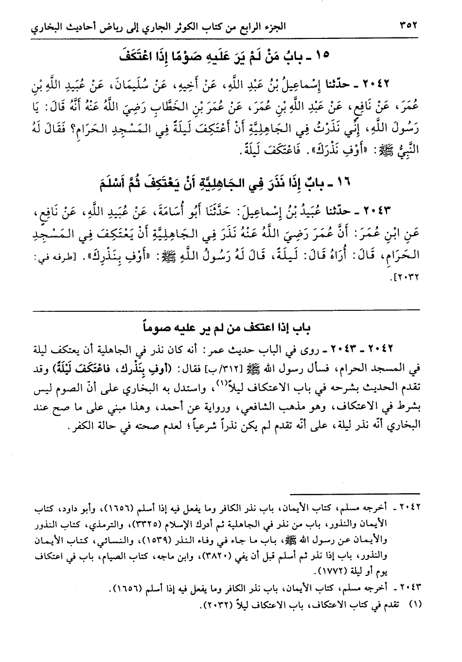 2042 - 2043 - روى في الباب حديث عمر: أنه كان نذر في الجاهلية أن يعتكف ليلة في المسجد الحرام، فسأل رسول الله - صلى الله عليه وسلم -، فقال: (أوفِ بِنَذْرك، فاعْتَكَفَ لَيْلَةً) وقد تقدم الحديث بشرحه في باب الاعتكاف ليلًا، واستدل به البخاري على أنّ الصوم ليس بشرط في الاعتكاف، وهو مذهب الشافعي، ورواية عن أحمد، وهذا مبني على ما صح عند البخاري أنّه نذر ليلة، على أنّه تقدم لم يكن نذرًا شرعيًّا؛ لعدم صحته في حالة الكفر.