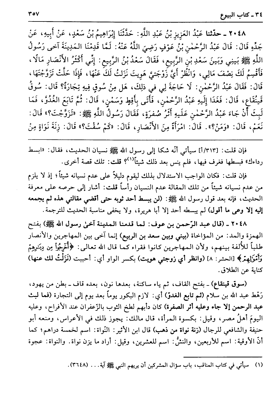 (سوق قينقاع) -بفتح القاف، ثم ياء ساكنة، بعدها نون، بعده قاف- بطن من يهود، رَهْط عبد الله بن سلام (ثم تابع الغدوّ) أي: لازم البكور يومًا بعد يوم إلى التجارة (فما لبث عبد الرحمن إلا جاء وعليه أثر الصفرة) كان دأبهم لطخ الثوب بالزّعفران عند الأفراح، وعليه اليومَ أهلُ مصر، وقيل: بكسوة المرأة، قال مالك: يجوز ذلك في الأعراس، ومنعه أبو حنيفة والشافعي للرجال (زنة نواة من ذهب) قال ابن الأثير: النّواة: اسم لخمسة دراهم؛ كما أنَّ الأوقية: اسم للأربعين، والنشُّ: اسم للعشرين، وقيل: أراد ما يزن نواة. والنواة: عجوة
