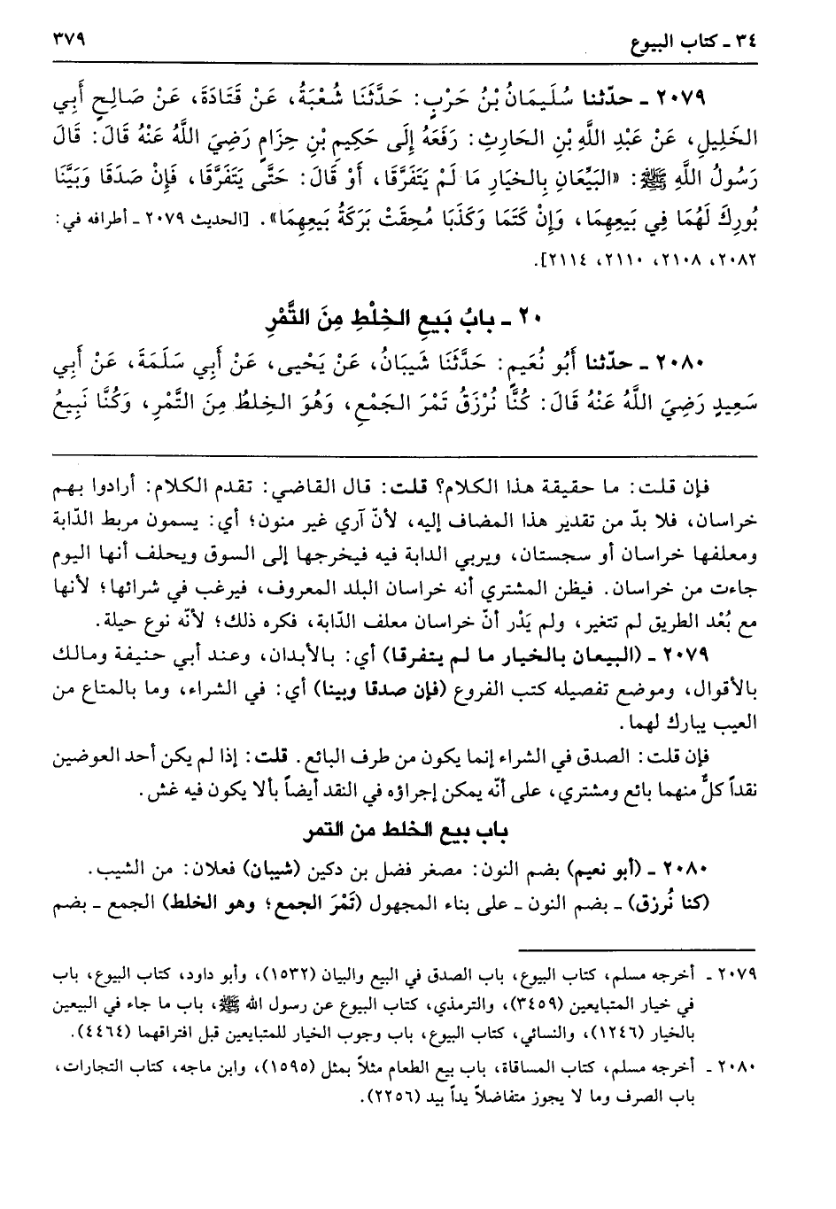2079 - (البيعان بالخبار مالم يتفرقا) أي: بالأبدان، وعند أبي حنيفة ومالك بالأقوال، وموضع تفصيله كتب الفروع (فإن صدقا وبينا) أي: في الشراء، وما بالمتاع من العيب يبارك لهما.