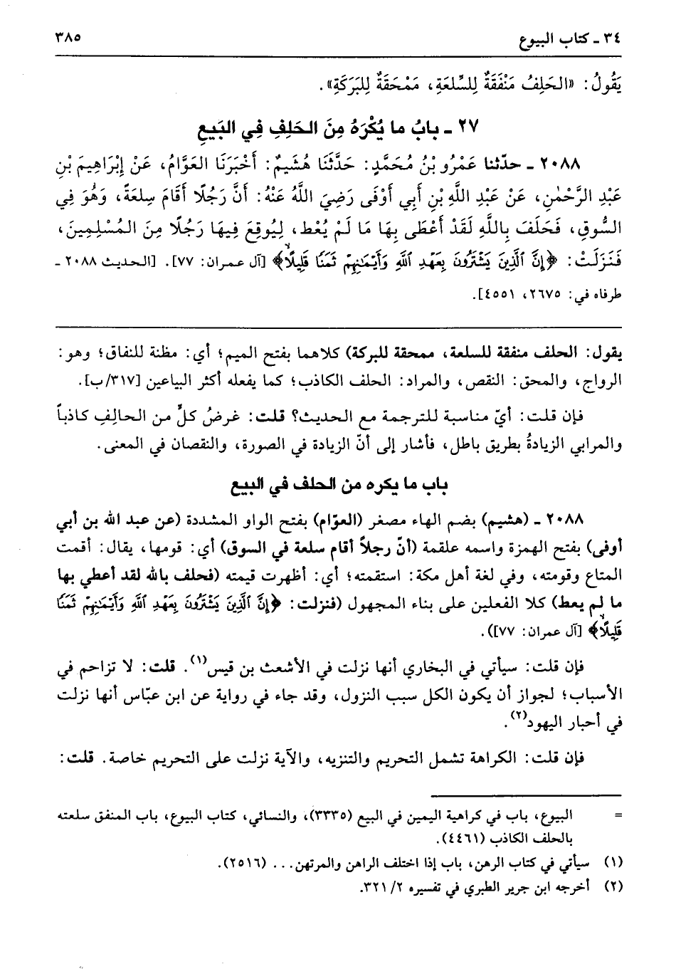 2088 - (هشيم) بضم الهاء مصغر (العوّام) بفتح الواو المشددة (عن عبد الله بن أبي أوفى) بفتح الهمزة واسمه علقمة (أنَّ رجلًا أقام سلعة في السوق) أي: قومها، يقال: أقمت المتاع وقومته، وفي لغة أهل مكة: استقمته؛ أي: أظهرت قيمته (فحلف بالله لقد أعطي بها ما لم يعط) كلا الفعلين على بناء المجهول (فنزلت: {إِنَّ الَّذِينَ يَشْتَرُونَ بِعَهْدِ اللَّهِ وَأَيْمَانِهِمْ ثَمَنًا قَلِيلًا} [آل عمران: 77]).