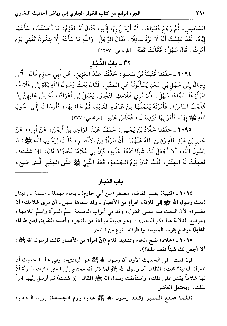 2094 - (قتيبة) بضم القاف، مصغر (عن أبي حازم) - بحاء مهملة - سلمة بن دينار (بعث رسول الله - صلى الله عليه وسلم - إلى فلانة، امرأةٍ من الأنصار- وقد سماها سهل - أن مري كلامك) أن مفسرة؛ لأن البعث فيه معنى القول، وقد في أبواب الجمعة اسمُ المرأة واسمُ غلامها، وموضع الدلالة هنا ذكر النجاري؛ وهو صيغة مبالغة من النجر، وأصله التفريق (من ظرفاء الغابة) موضع بقرب المدينة، والظرفاء: نوع من الشجر.