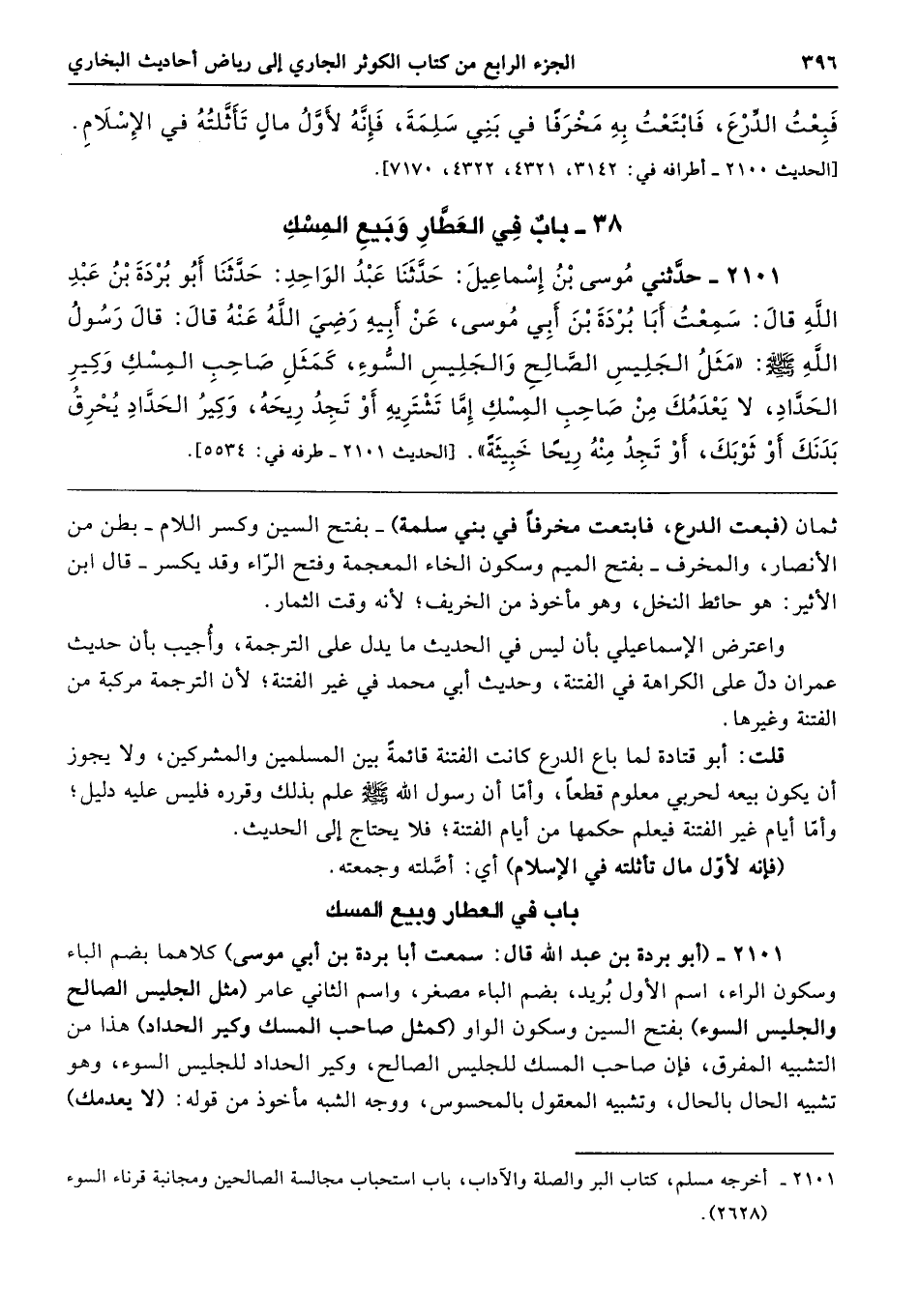 2101 - حَدَّثَنِى مُوسَى بْنُ إِسْمَاعِيلَ حَدَّثَنَا عَبْدُ الْوَاحِدِ حَدَّثَنَا أَبُو بُرْدَةَ بْنُ عَبْدِ اللَّهِ قَالَ سَمِعْتُ أَبَا بُرْدَةَ بْنَ أَبِى مُوسَى عَنْ أَبِيهِ - رضى الله عنه - قَالَ قَالَ رَسُولُ اللَّهِ - صلى الله عليه وسلم - «مَثَلُ الْجَلِيسِ الصَّالِحِ وَالْجَلِيسِ السَّوْءِ كَمَثَلِ صَاحِبِ الْمِسْكِ، وَكِيرِ الْحَدَّادِ، لاَ يَعْدَمُكَ مِنْ صَاحِبِ الْمِسْكِ إِمَّا تَشْتَرِيهِ، أَوْ تَجِدُ رِيحَهُ، وَكِيرُ الْحَدَّادِ يُحْرِقُ بَدَنَكَ أَوْ ثَوْبَكَ أَوْ تَجِدُ مِنْهُ رِيحًا خَبِيثَةً». طرفه 5534
