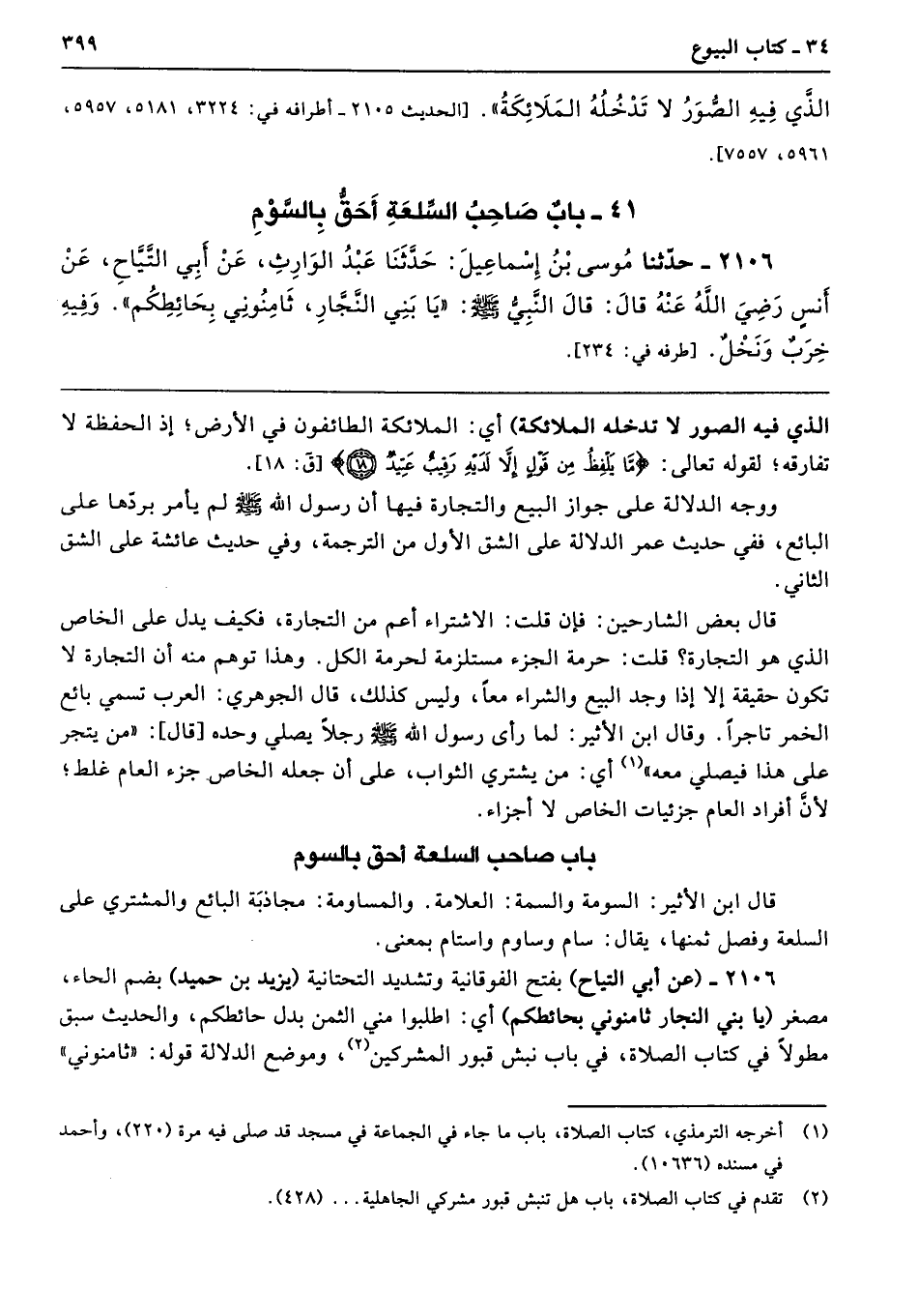 2106 - (عن أبي التياح) بفتح الفوقانية وتشديد التحتانية (يزيد بن حميد) بضم الحاء، مصغر (يا بني النجار ثامنوني بحائطكم) أي: اطلبوا مني الثمن بدل حائطكم، والحديث سبق مطولًا في كتاب الصلاة، في باب نبش قبور المشركين، وموضع الدلالة قوله: "ثامنوني"