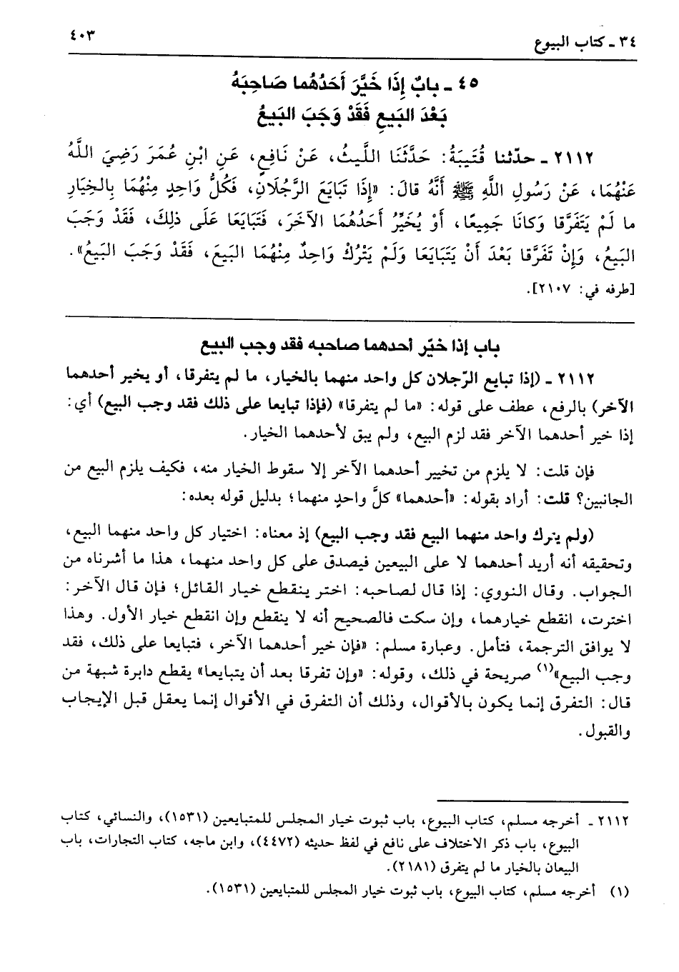 2112 - حَدَّثَنَا قُتَيْبَةُ حَدَّثَنَا اللَّيْثُ عَنْ نَافِعٍ عَنِ ابْنِ عُمَرَ - رضى الله عنهما - عَنْ رَسُولِ اللَّهِ - صلى الله عليه وسلم - أَنَّهُ قَالَ «إِذَا تَبَايَعَ الرَّجُلاَنِ فَكُلُّ وَاحِدٍ مِنْهُمَا بِالْخِيَارِ، مَا لَمْ يَتَفَرَّقَا، وَكَانَا جَمِيعًا، أَوْ يُخَيِّرُ أَحَدُهُمَا الآخَرَ فَتَبَايَعَا عَلَى ذَلِكَ، فَقَدْ وَجَبَ الْبَيْعُ، وَإِنْ تَفَرَّقَا بَعْدَ أَنْ يَتَبَايَعَا، وَلَمْ يَتْرُكْ وَاحِدٌ مِنْهُمَا الْبَيْعَ، فَقَدْ وَجَبَ الْبَيْعُ». أطرافه 2107