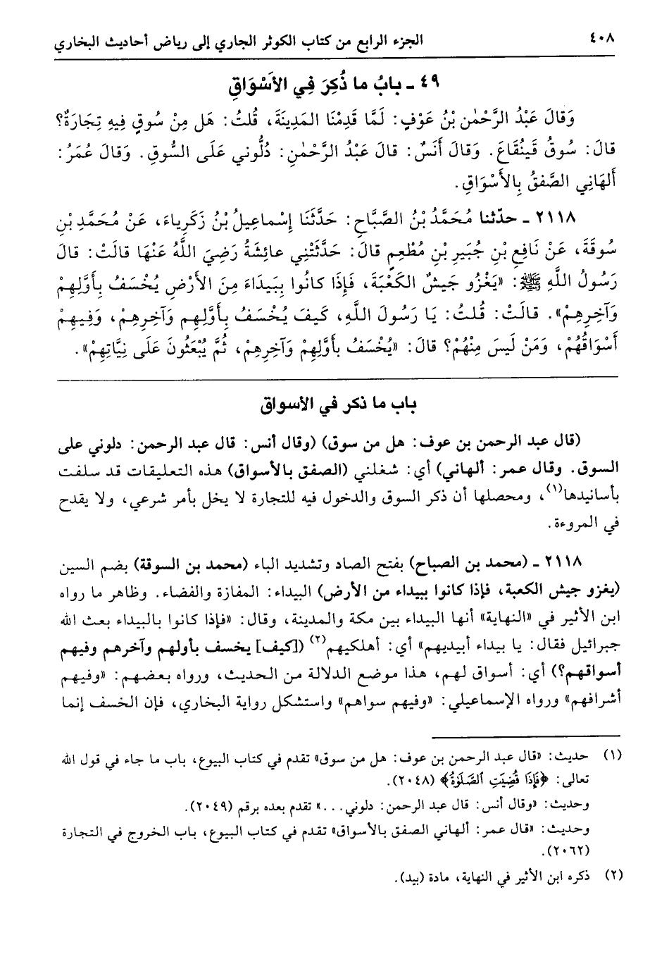 2118 - (محمد بن الصباح) بفتح الصاد وتشديد الباء (محمد بن السوقة) بضم السين (يغزو جيش الكعبة، فإذا كانوا ببيداء من الأرض) البيداء: المفازة والفضاء. وظاهر ما رواه ابن الأثير في "النهاية" أنها البيداء بين مكة والمدينة، وقال: "فإذا كانوا بالبيداء بعث الله جبرائيل فقال: يا بيداء أبيديهم" أي: أهلكيهم ([كيف] يخسف بأولهم وآخرهم وفيهم أسواقهم؟) أي: أسواق لهم، هذا موضع الدلالة من الحديث، ورواه بعضهم: "وفيهم أشرافهم" ورواه الإسماعيلي: "وفيهم سواهم" واستشكل رواية البخاري، فإن الخسف إنما