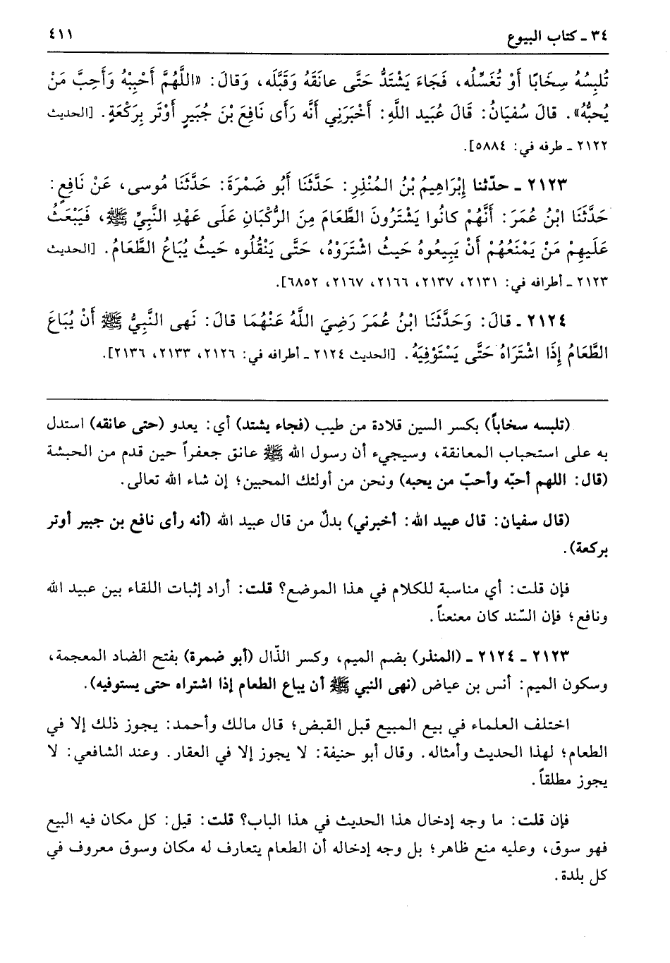 2124 - قَالَ وَحَدَّثَنَا ابْنُ عُمَرَ - رضى الله عنهما - قَالَ نَهَى النَّبِىُّ - صلى الله عليه وسلم - أَنْ يُبَاعَ الطَّعَامُ إِذَا اشْتَرَاهُ حَتَّى يَسْتَوْفِيَهُ. أطرافه 2126، 2133، 2136