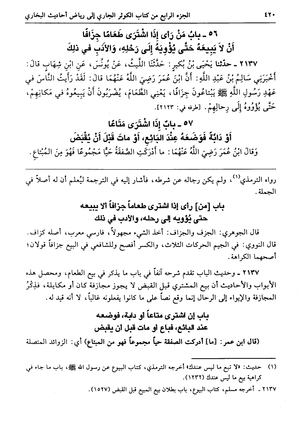 2137 - وحديث الباب تقدم شرحه آنفًا في باب ما يذكر في بيع الطعام، ومحصل هذه الأبواب والأحاديث أن بيع المشتري قبل القبض لا يجوز مجازفة كان أو مكايلة، فذِكْرُ المجازفة والإيواء إلى الرحال إنما وقع نصًّا على ما كانوا يفعلونه غالبًا، لا أنه قيد له.