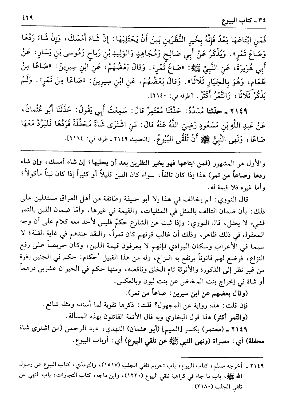2149 - حَدَّثَنَا مُسَدَّدٌ حَدَّثَنَا مُعْتَمِرٌ قَالَ سَمِعْتُ أَبِى يَقُولُ حَدَّثَنَا أَبُو عُثْمَانَ عَنْ عَبْدِ اللَّهِ بْنِ مَسْعُودٍ - رضى الله عنه - قَالَ مَنِ اشْتَرَى شَاةً مُحَفَّلَةً، فَرَدَّهَا فَلْيَرُدَّ مَعَهَا صَاعًا. وَنَهَى النَّبِىُّ - صلى الله عليه وسلم - أَنْ تُلَقَّى الْبُيُوعُ. طرفه 2164