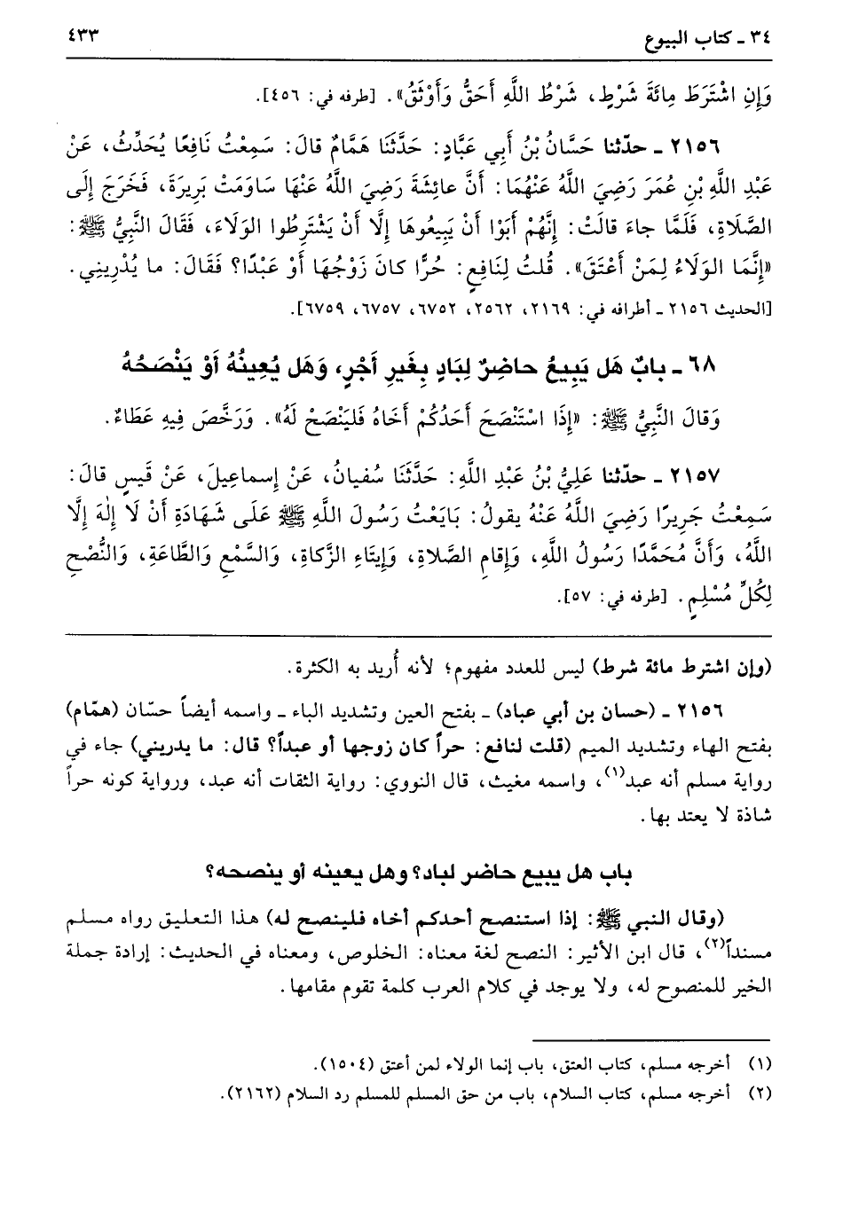 2156 - (حسان بن أبي عباد) -بفتح العين وتشديد الباء- واسمه أَيضًا حسّان (همّام) بفتح الهاء وتشديد الميم (قلت لنافع: حرًّا كان زوجها أو عبدًا؟ قال: ما يدريني) جاء في رواية مسلم أنَّه عبد، واسمه مغيث، قال النووي: رواية الثِّقات أنَّه عبد، ورواية كونه حرًا شاذة لا يعتد بها.