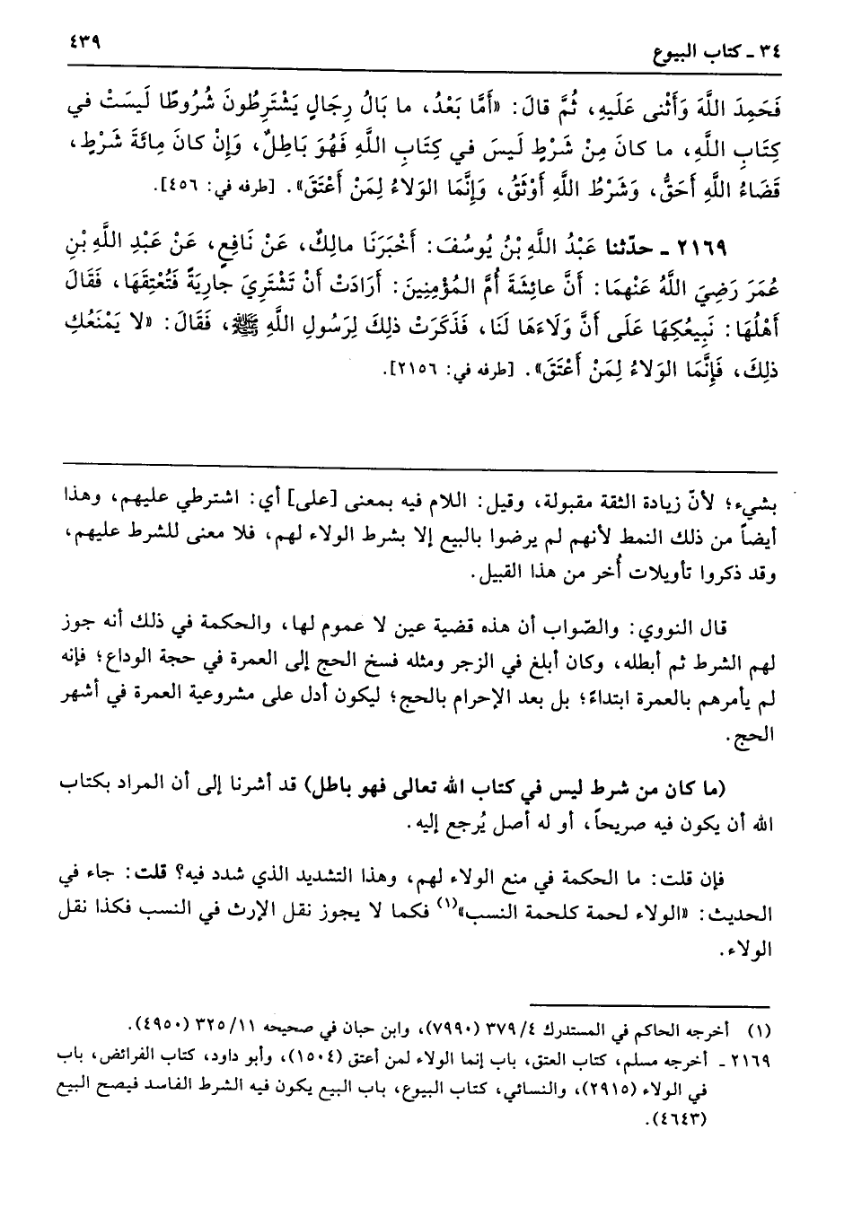 2169 - حَدَّثَنَا عَبْدُ اللَّهِ بْنُ يُوسُفَ أَخْبَرَنَا مَالِكٌ عَنْ نَافِعٍ عَنْ عَبْدِ اللَّهِ بْنِ عُمَرَ - رضى الله عنهما - أَنَّ عَائِشَةَ أُمَّ الْمُؤْمِنِينَ أَرَادَتْ أَنْ تَشْتَرِىَ جَارِيَةً فَتُعْتِقَهَا، فَقَالَ أَهْلُهَا نَبِيعُكِهَا عَلَى أَنَّ وَلاَءَهَا لَنَا. فَذَكَرَتْ ذَلِكَ لِرَسُولِ اللَّهِ - صلى الله عليه وسلم - فَقَالَ «لاَ يَمْنَعُكِ ذَلِكَ، فَإِنَّمَا الْوَلاَءُ لِمَنْ أَعْتَقَ». طرفه 2156