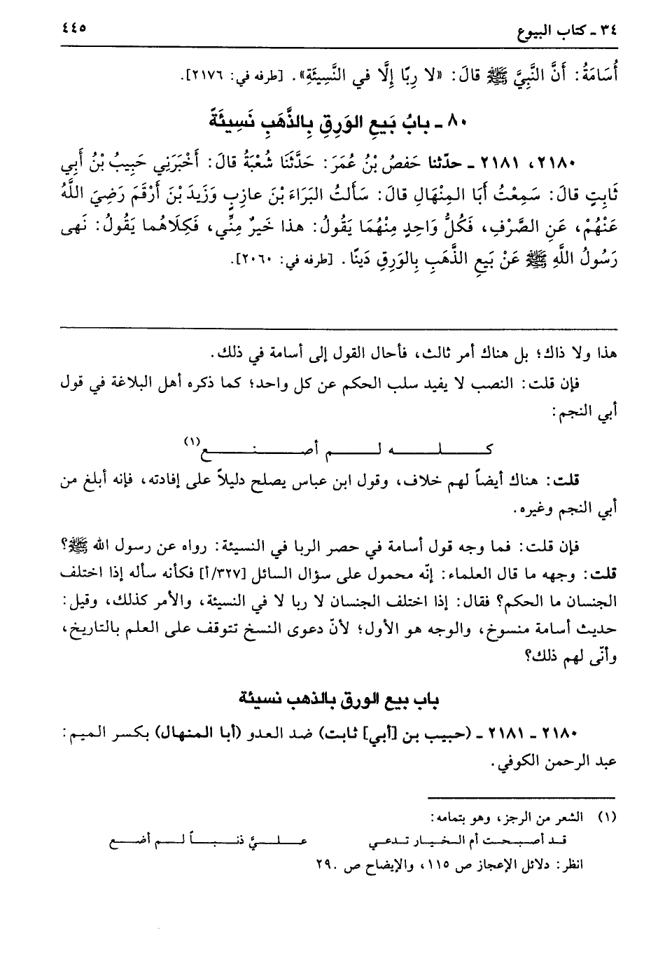 أُسَامَةُ أَنَّ النَّبِىَّ - صلى الله عليه وسلم - قَالَ «لاَ رِبًا إِلاَّ فِي النَّسِيئَةِ». طرفه 2176