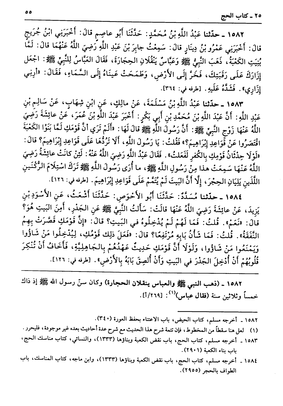 1584 - حَدَّثَنَا مُسَدَّدٌ حَدَّثَنَا أَبُو الأَحْوَصِ حَدَّثَنَا أَشْعَثُ عَنِ الأَسْوَدِ بْنِ يَزِيدَ عَنْ عَائِشَةَ - رضى الله عنها - قَالَتْ سَأَلْتُ النَّبِىَّ - صلى الله عليه وسلم - عَنِ الْجَدْرِ أَمِنَ الْبَيْتِ هُوَ قَالَ «نَعَمْ». قُلْتُ فَمَا لَهُمْ لَمْ يُدْخِلُوهُ فِي الْبَيْتِ قَالَ «إِنَّ قَوْمَكِ قَصَّرَتْ بِهِمُ النَّفَقَةُ». قُلْتُ فَمَا شَأْنُ بَابِهِ مُرْتَفِعًا قَالَ «فَعَلَ ذَلِكِ قَوْمُكِ لِيُدْخِلُوا مَنْ شَاءُوا وَيَمْنَعُوا مَنْ شَاءُوا، وَلَوْلاَ أَنَّ قَوْمَكِ حَدِيثٌ عَهْدُهُمْ بِالْجَاهِلِيَّةِ فَأَخَافُ أَنْ تُنْكِرَ قُلُوبُهُمْ أَنْ أُدْخِلَ الْجَدْرَ فِي الْبَيْتِ وَأَنْ أُلْصِقَ بَابَهُ بِالأَرْضِ». طرفه 126
