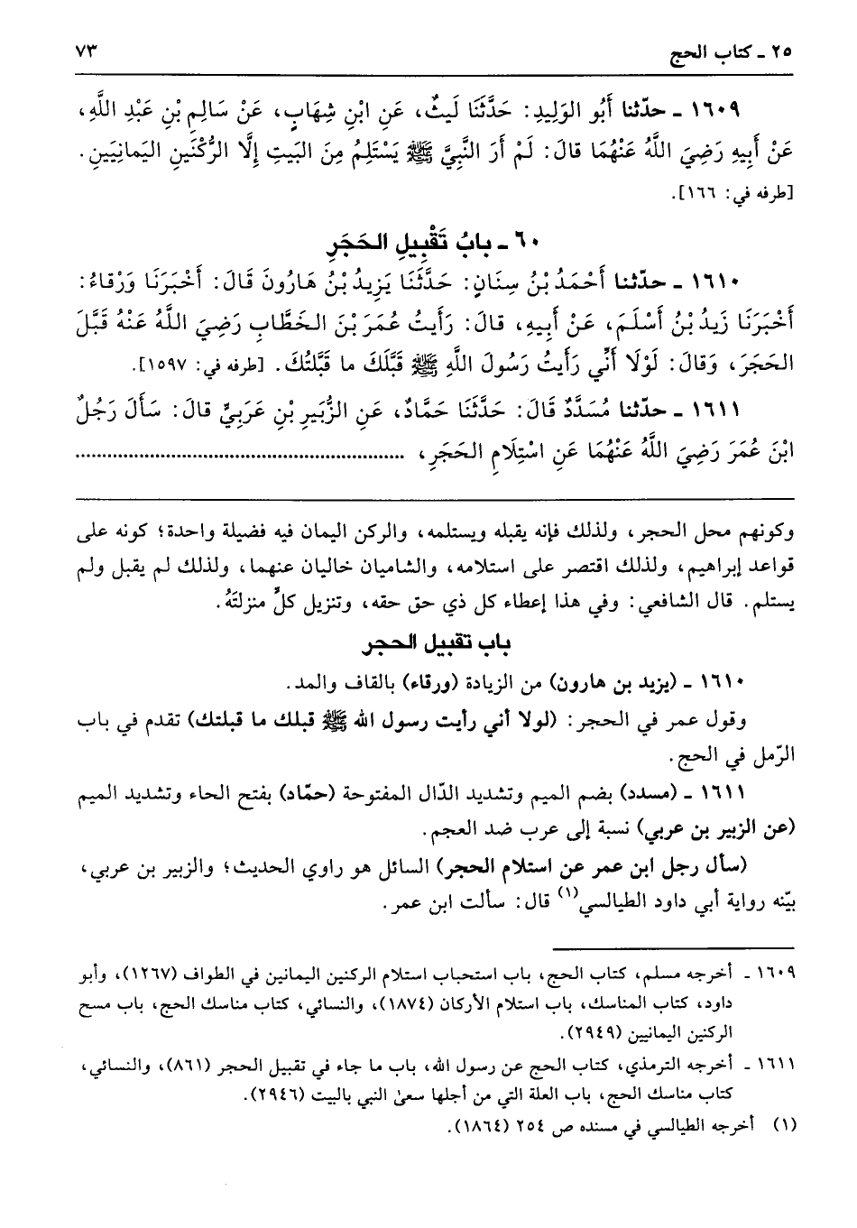 1611 - (مسدد) بضم الميم وتشديد الدّال المفتوحة (حمّاد) بفتح الحاء وتشديد الميم (عن الزبير بن عربي) نسبة إلى عرب ضد العجم.