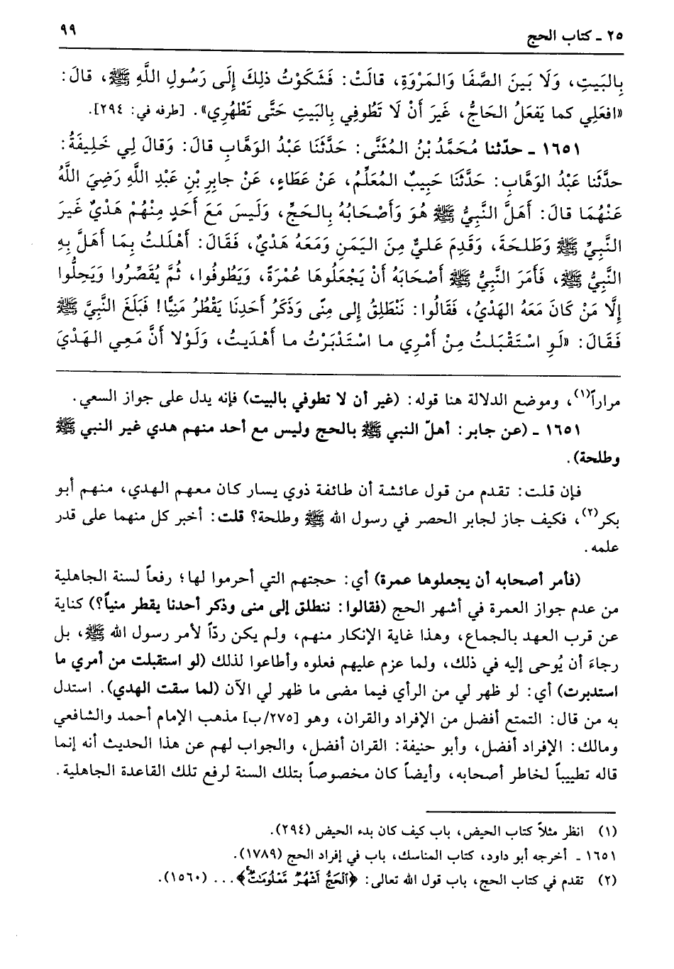 1651 - (عن جابر: أهلّ النبي - صلى الله عليه وسلم - بالحج وليس مع أحد منهم هدي غير النبي - صلى الله عليه وسلم - وطلحة).