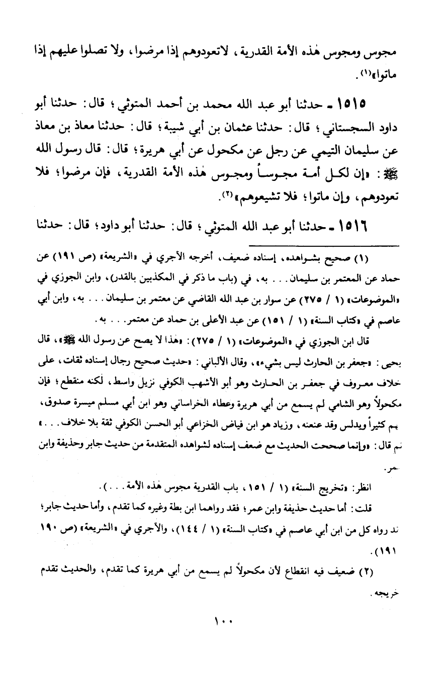 1515 - حَدَّثَنَا أَبُو عَبْدِ اللَّهِ مُحَمَّدُ بْنُ أَحْمَدَ الْمَتُّوثِيُّ قَالَ: حَدَّثَنَا أَبُو دَاوُدَ السِّجِسْتَانِيُّ، قَالَ: حَدَّثَنَا عُثْمَانُ بْنُ أَبِي شَيْبَةَ، قَالَ: حَدَّثَنَا مُعَاذُ بْنُ مُعَاذٍ، عَنْ سُلَيْمَانَ التَّيْمِيِّ، عَنْ رَجُلٍ، عَنْ مَكْحُولٍ، عَنْ أَبِي هُرَيْرَةَ، قَالَ: قَالَ رَسُولُ اللَّهِ صَلَّى اللَّهُ عَلَيْهِ وَسَلَّمَ: «إِنَّ §لِكُلِّ أُمَّةٍ مَجُوسًا، وَمَجُوسُ هَذِهِ الْأُمَّةِ الْقَدَرِيَّةُ، فَإِنْ مَرِضُوا فَلَا تَعُودُوهُمْ، وَإِنَّ مَاتُوا فَلَا تُشَيِّعُوهُمْ»