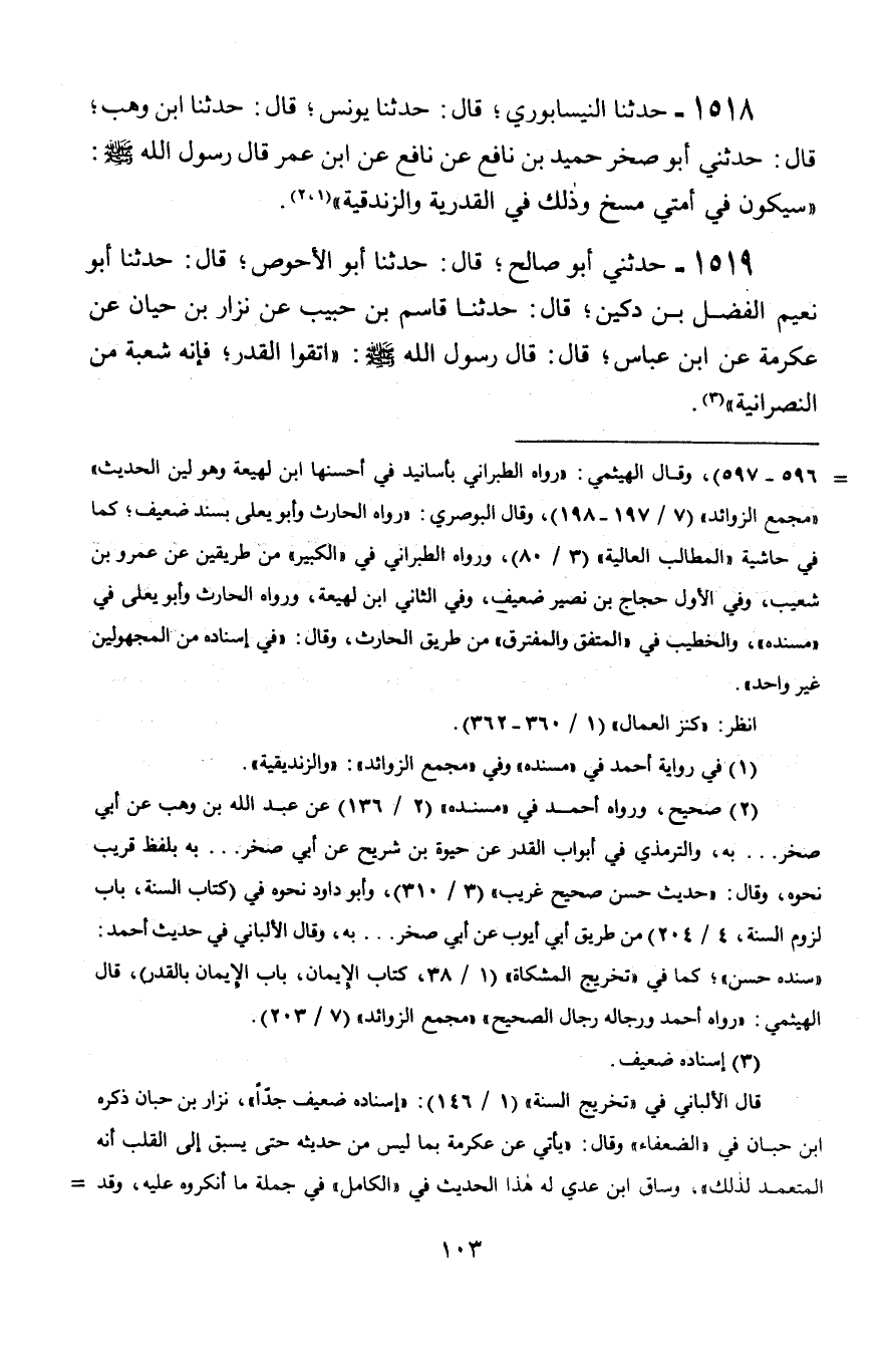 1518 - حَدَّثَنَا النَّيْسَابُورِيُّ، قَالَ: حَدَّثَنَا يُونُسُ، قَالَ: حَدَّثَنَا ابْنُ وَهْبٍ، قَالَ: حَدَّثَنِي أَبُو صَخْرٍ حُمَيْدُ بْنُ نَافِعٍ عَنْ نَافِعٍ، عَنِ ابْنِ عُمَرَ، قَالَ رَسُولُ اللَّهِ صَلَّى اللَّهُ عَلَيْهِ وَسَلَّمَ: § «سَيَكُونُ فِي أُمَّتِي مَسْخٌ وَذَلِكَ فِي الْقَدَرِيَّةِ وَالزَّنْدَقِيَّةِ»