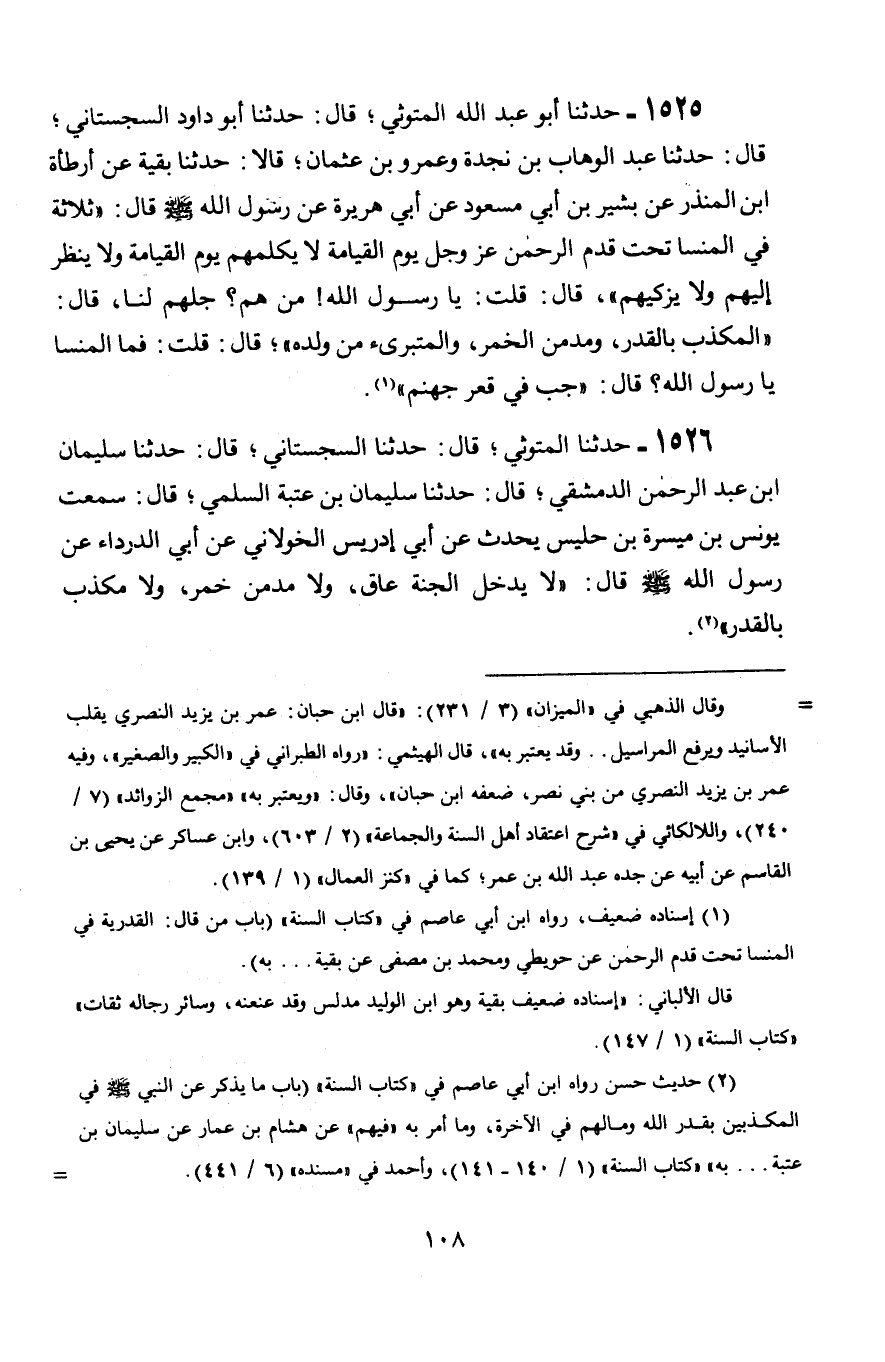 1526 - حَدَّثَنَا الْمَتُّوثِيُّ، قَالَ: حَدَّثَنَا السِّجِسْتَانِيُّ، قَالَ: حَدَّثَنَا سُلَيْمَانُ بْنُ عَبْدِ الرَّحْمَنِ الدِّمَشْقِيُّ، قَالَ: حَدَّثَنَا سُلَيْمَانُ بْنُ عُتْبَةَ السُّلَمِيُّ، قَالَ: سَمِعْتُ يُونُسَ بْنَ مَيْسَرَةَ بْنِ حَلْبَسٍ، يُحَدِّثُ عَنْ أَبِي إِدْرِيسَ الْخَوْلَانِيِّ، عَنْ أَبِي الدَّرْدَاءِ، عَنْ رَسُولِ اللَّهِ صَلَّى اللَّهُ عَلَيْهِ وَسَلَّمَ قَالَ: «§لَا يَدْخُلُ الْجَنَّةَ عَاقٌّ، وَلَا مُدْمِنُ خَمْرٍ، وَلَا مُكَذِّبٌ بِالْقَدَرِ»