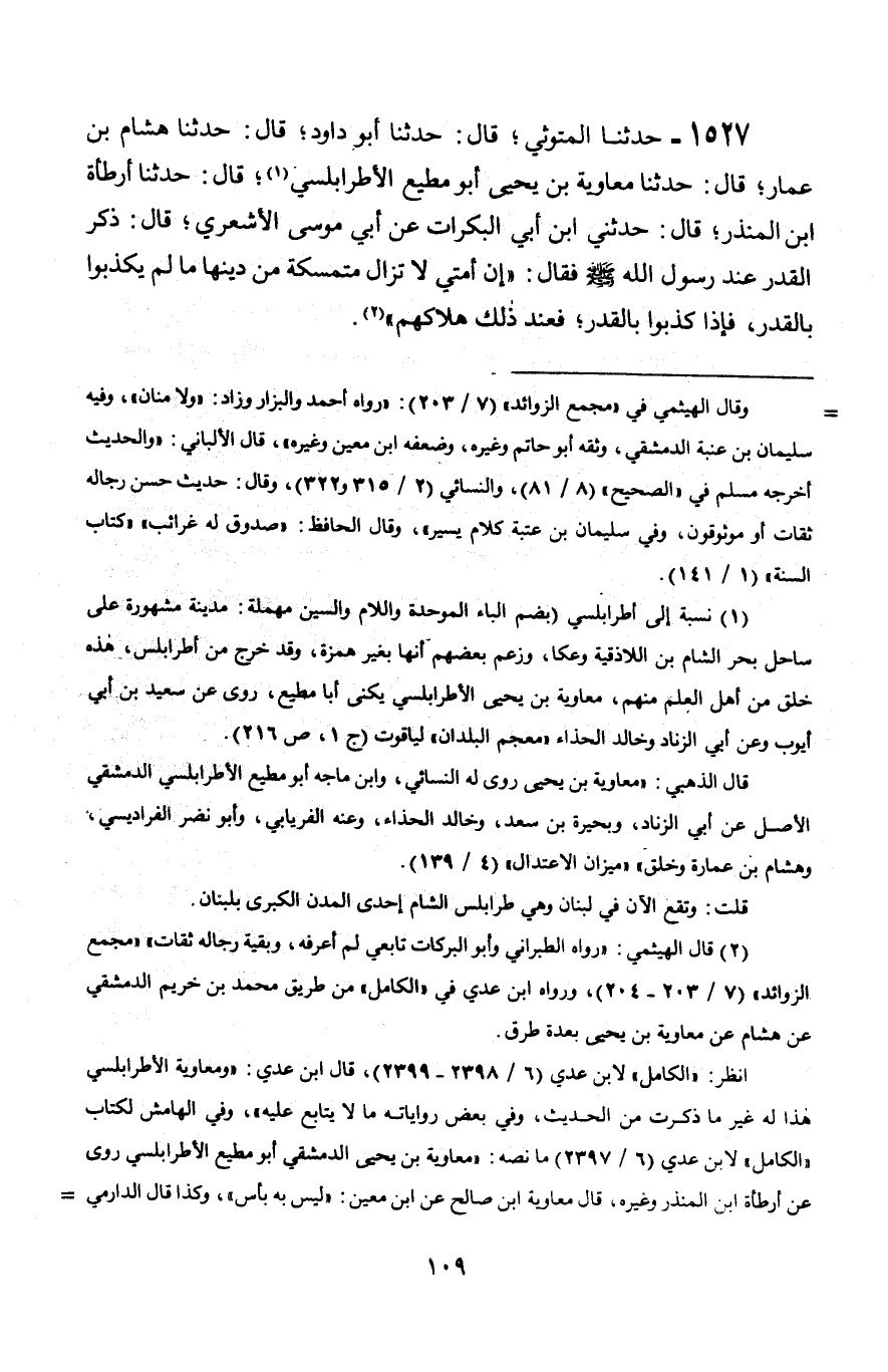 1527 - حَدَّثَنَا الْمَتُّوثِيُّ، قَالَ: حَدَّثَنَا أَبُو دَاوُدَ، قَالَ: حَدَّثَنَا هِشَامُ بْنُ عَمَّارٍ، قَالَ: حَدَّثَنَا مُعَاوِيَةُ بْنُ يَحْيَى أَبُو مُطِيعٍ الْأَطْرَابُلُسِيُّ، قَالَ: حَدَّثَنَا أَرْطَاةُ بْنُ الْمُنْذِرِ، قَالَ: حَدَّثَنِي ابْنُ أَبِي الْبَكَرَاتِ، عَنْ أَبِي مُوسَى الْأَشْعَرِيِّ، قَالَ: ذُكِرَ الْقَدَرُ عِنْدَ رَسُولِ اللَّهِ صَلَّى اللَّهُ عَلَيْهِ وَسَلَّمَ فَقَالَ: «إِنَّ §أُمَّتِي لَا تَزَالُ مُتَمَسِّكَةً مِنْ دِينِهَا مَا لَمْ يُكَذِّبُوا بِالْقَدَرِ، فَإِذَا كَذَّبُوا بِالْقَدَرِ، فَعِنْدَ ذَلِكَ هَلَاكُهُمْ»