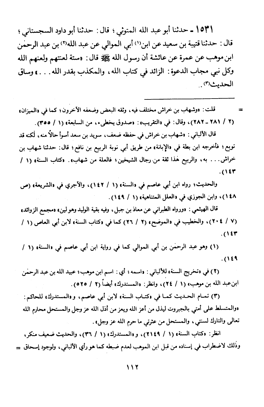 1531 - حَدَّثَنَا أَبُو عَبْدِ اللَّهِ الْمَتُّوثِيُّ، قَالَ: حَدَّثَنَا أَبُو دَاوُدَ السِّجِسْتَانِيُّ، قَالَ: حَدَّثَنَا قُتَيْبَةُ بْنُ سَعِيدٍ، عَنِ ابْنِ أَبِي الْمَوَالِي، عَنْ عَبْدِ اللَّهِ بْنِ عَبْدِ الرَّحْمَنِ بْنِ مَوْهَبٍ، عَنْ عَمْرَةَ، عَنْ عَائِشَةَ، أَنَّ رَسُولَ اللَّهِ صَلَّى اللَّهُ عَلَيْهِ وَسَلَّمَ قَالَ: " §سِتَّةٌ لَعَنْتُهُمْ وَلَعَنَهُمُ اللَّهُ وَكُلُّ نَبِيٍّ مُجَابِ الدَّعْوَةِ: الزَّائِدُ فِي كِتَابِ اللَّهِ، وَالْمُكَذِّبُ بِقَدَرِ اللَّهِ " وَسَاقَ الْحَدِيثَ