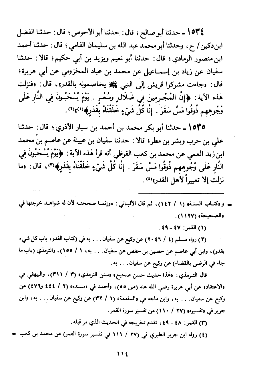1534 - حَدَّثَنَا أَبُو صَالِحٍ، قَالَ: حَدَّثَنَا أَبُو الْأَحْوَصِ، قَالَ: حَدَّثَنَا الْفَضْلُ بْنُ دُكَيْنٍ، ح وَحَدَّثَنَا أَبُو مُحَمَّدٍ عَبْدُ اللَّهِ بْنُ سُلَيْمَانَ الْفَامِيُّ، قَالَ: حَدَّثَنَا أَحْمَدُ بْنُ مَنْصُورٍ الرَّمَادِيُّ، قَالَ: حَدَّثَنَا أَبُو نُعَيْمٍ، وَيَزِيدُ بْنُ أَبِي حَكِيمٍ، قَالَا: حَدَّثَنَا سُفْيَانُ، عَنْ زِيَادِ بْنِ إِسْمَاعِيلَ، عَنْ مُحَمَّدِ بْنِ عَبَّادٍ الْمَخْزُومِيِّ، عَنْ أَبِي هُرَيْرَةَ، قَالَ: جَاءَتْ مُشْرِكُو قُرَيْشٍ إِلَى النَّبِيِّ صَلَّى اللَّهُ عَلَيْهِ وَسَلَّمَ يُخَاصِمُونَهُ بِالْقَدَرِ قَالَ: فَنَزَلَتْ هَذِهِ الْآيَةُ {§إِنَّ الْمُجْرِمِينَ فِي ضَلَالٍ وَسُعُرٍ يَوْمَ يُسْحَبُونَ فِي النَّارِ عَلَى وُجُوهِهِمْ ذُوقُوا مَسَّ سَقَرَ إِنَّا كُلَّ شَيْءٍ خَلَقْنَاهُ بِقَدَرٍ} [القمر: 48]