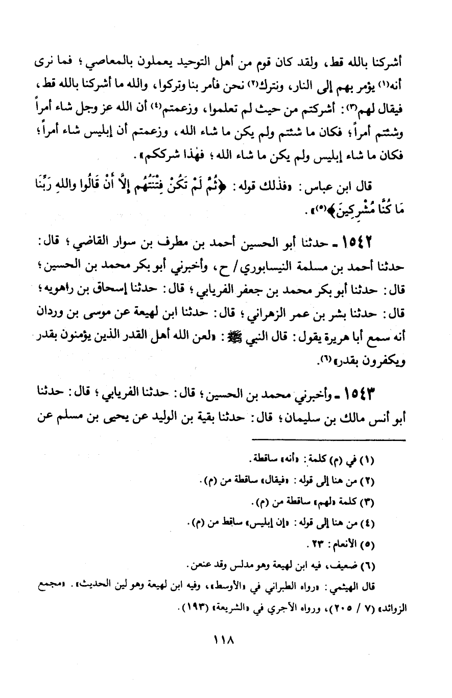1543 - وَأَخْبَرَنِي مُحَمَّدُ بْنُ الْحُسَيْنِ، قَالَ: حَدَّثَنَا الْفِرْيَابِيُّ، قَالَ: حَدَّثَنَا أَبُو أَنَسٍ مَالِكُ بْنُ سُلَيْمَانَ قَالَ: حَدَّثَنَا بَقِيَّةُ بْنُ الْوَلِيدِ، عَنْ يَحْيَى بْنِ مُسْلِمٍ، عَنْ -[119]- بَحْرٍ السَّقَّا، وَعَنْ أَبِي حَازِمٍ، عَنْ أَبِي هُرَيْرَةَ، عَنِ النَّبِيِّ صَلَّى اللَّهُ عَلَيْهِ وَسَلَّمَ: § «مَا كَانَتْ زَنْدَقَةٌ إِلَّا كَانَتْ أَصْلُهَا التَّكْذِيبَ بِالْقَدَرِ»