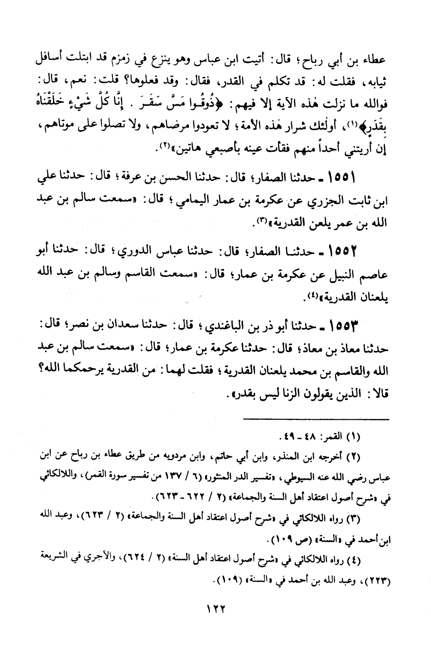 1551 - حَدَّثَنَا الصَّفَّارُ، قَالَ: حَدَّثَنَا الْحَسَنُ بْنُ عَرَفَةَ، قَالَ: حَدَّثَنَا عَلِيُّ بْنُ ثَابِتٍ الْجَزَرِيُّ، عَنْ عِكْرِمَةَ بْنِ عَمَّارٍ الْيَمَامِيِّ، قَالَ: سَمِعْتُ سَالِمَ بْنَ عَبْدِ اللَّهِ بْنِ عُمَرَ، §يَلْعَنُ الْقَدَرِيَّةَ "
