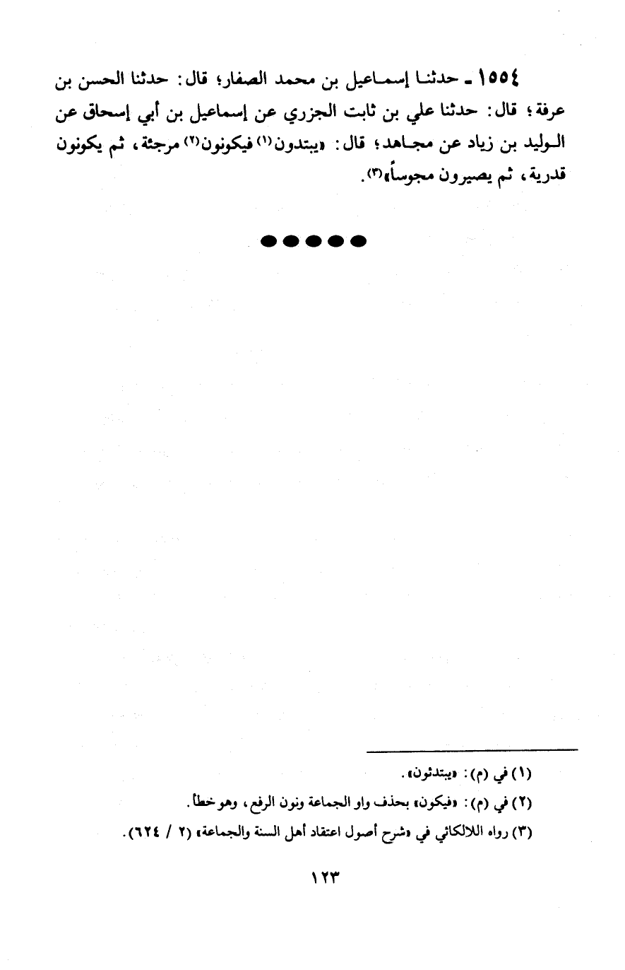 1554 - حَدَّثَنَا إِسْمَاعِيلُ بْنُ مُحَمَّدٍ الصَّفَّارُ، قَالَ: حَدَّثَنَا الْحَسَنُ بْنُ عَرَفَةَ، قَالَ: حَدَّثَنَا عَلِيُّ بْنُ ثَابِتٍ الْجَزَرِيُّ، عَنْ إِسْمَاعِيلَ بْنِ أَبِي إِسْحَاقَ، عَنِ الْوَلِيدِ بْنِ زِيَادٍ، عَنْ مُجَاهِدٍ، قَالَ: §يَبْتَدُونَ فَيَكُونُونَ مُرْجِئَةً، ثُمَّ يَكُونُونَ قَدِرِيَّةً، ثُمَّ يَصِيرُونَ مَجُوسًا "