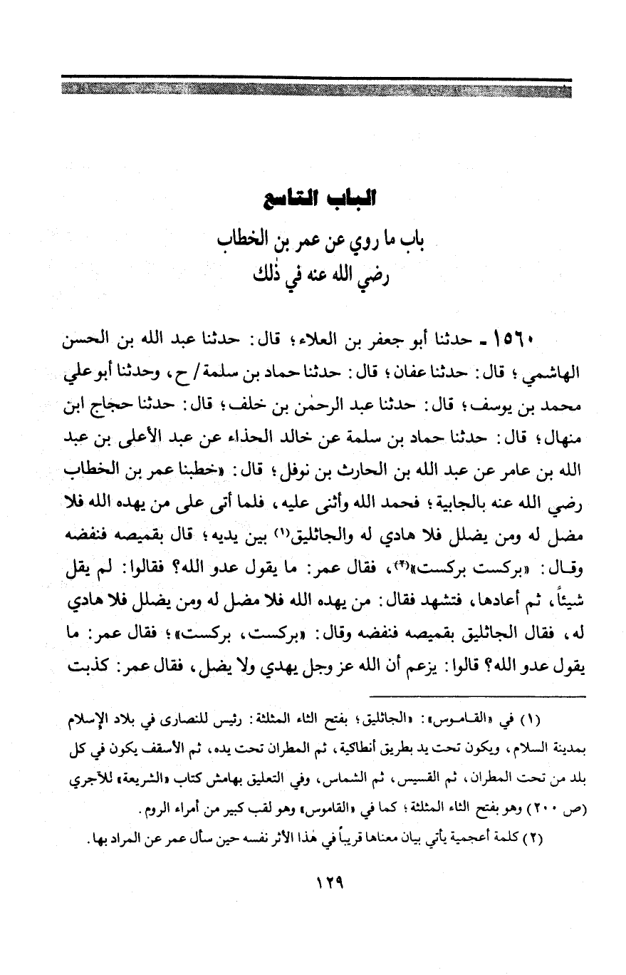 1560 - حَدَّثَنَا أَبُو جَعْفَرِ بْنُ الْعَلَاءِ، قَالَ: حَدَّثَنَا عَبْدُ اللَّهِ بْنُ الْحَسَنِ الْهَاشِمِيُّ، قَالَ: حَدَّثَنَا عَفَّانُ، قَالَ: حَدَّثَنَا حَمَّادُ بْنُ سَلَمَةَ، ح وَحَدَّثَنَا أَبُو عَلِيٍّ مُحَمَّدُ بْنُ يُوسُفَ قَالَ: حَدَّثَنَا عَبْدُ الرَّحْمَنِ بْنُ خَلَفٍ، قَالَ: حَدَّثَنَا حَجَّاجُ بْنُ مِنْهَالٍ، قَالَ: حَدَّثَنَا حَمَّادُ بْنُ سَلَمَةَ، عَنْ خَالِدٍ الْحَذَّاءِ، عَنْ عَبْدِ الْأَعْلَى بْنِ عَبْدِ اللَّهِ بْنِ عَامِرٍ، عَنْ عَبْدِ اللَّهِ بْنِ الْحَارِثِ بْنِ نَوْفَلٍ، قَالَ: خَطَبَنَا عُمَرُ بْنُ الْخَطَّابِ رَضِيَ اللَّهُ عَنْهُ بِالْجَابِيَةِ، فَحَمِدَ اللَّهَ وَأَثْنَى عَلَيْهِ، فَلَمَّا أَتَى عَلَى §مَنْ يَهْدِهِ اللَّهُ فَلَا مُضِلَّ لَهُ وَمَنْ يُضْلِلْ فَلَا هَادِيَ لَهُ، وَالْجَاثَلِيقُ بَيْنَ يَدَيْهِ، قَالَ بِقَمِيصِهِ فَنَفَضَهُ وَقَالَ: بركست بركست، فَقَالَ عُمَرُ: مَا يَقُولُ عَدُوُّ اللَّهِ؟ فَقَالُوا: لَمْ يَقُلْ شَيْئًا، ثُمَّ أَعَادَهَا فَتَشَهَّدَ فَقَالَ: مَنْ يَهْدِهِ اللَّهُ فَلَا مُضِلَّ لَهُ وَمَنْ يُضْلِلْ فَلَا هَادِيَ لَهُ، فَقَالَ الْجَاثَلِيقُ بِقَمِيصِهِ فَنَفَضَهُ وَقَالَ: بركست بركست، فَقَالَ عُمَرُ: مَا يَقُولُ عَدُوُّ اللَّهِ؟ قَالُوا: يَزْعُمُ أَنَّ اللَّهَ عَزَّ وَجَلَّ يَهْدِي وَلَا يُضِلُّ، فَقَالَ عُمَرُ: كَذَبْتَ -[130]- يَا عَدُوَّ اللَّهِ، بَلِ اللَّهُ عَزَّ وَجَلَّ خَلَقَكَ وَهُوَ أَضَلَّكَ، وَهُوَ يُدْخِلُكَ النَّارَ إِنْ شَاءَ اللَّهُ، وَاللَّهِ لَوْلَا لَوْثُ عَهْدٍ لَكَ لَضَرَبْتُ عُنُقَكَ، ثُمَّ قَالَ عُمَرُ: إِنَّ اللَّهَ عَزَّ وَجَلَّ لَمَّا خَلَقَ آدَمَ عَلَيْهِ السَّلَامُ نَثَرَ ذُرِّيَّتَهُ فِي يَدِهِ، فَكَتَبَ أَهْلَ الْجَنَّةِ وَأَعْمَالَهُمْ، وَأَهْلَ النَّارِ وَأَعْمَالَهُمْ، وَقَالَ: هَذِهِ لِهَذِهِ، وَهَذِهِ لِهَذِهِ، فَتَفَرَّقَ النَّاسُ يَوْمَئِذٍ وَهُمْ لَا يَخْتَلِفُونَ فِي الْقَدَرِ "