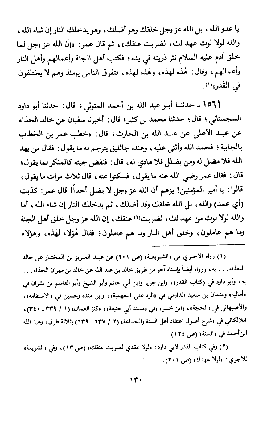 1561 - حَدَّثَنَا أَبُو عَبْدِ اللَّهِ بْنُ أَحْمَدَ الْمَتُّوثِيُّ، قَالَ: حَدَّثَنَا أَبُو دَاوُدَ السِّجِسْتَانِيُّ، قَالَ: حَدَّثَنَا مُحَمَّدُ بْنُ كَثِيرٍ، قَالَ: أَخْبَرَنَا سُفْيَانُ، عَنْ خَالِدٍ الْحَذَّاءِ، عَنْ عَبْدِ الْأَعْلَى، عَنْ عَبْدِ اللَّهِ بْنِ الْحَارِثِ، قَالَ: خَطَبَ عُمَرُ بْنُ الْخَطَّابِ بِالْجَابِيَةِ، فَحَمِدَ اللَّهَ وَأَثْنَى عَلَيْهِ، وَعِنْدَهُ جَاثَلِيقُ يُتَرْجِمُ لَهُ مَا يَقُولُ: فَقَالَ: §مَنْ يَهْدِ اللَّهُ فَلَا مُضِلَّ لَهُ، وَمَنْ يُضْلِلْ فَلَا هَادِيَ لَهُ قَالَ: فَنَفَضَ جُبَّتَهُ كَالْمُنْكِرِ لِمَا يَقُولُ، قَالَ: فَقَالَ عُمَرُ رَضِيَ اللَّهُ عَنْهُ: مَا يَقُولُ؟ فَسَكَتُوا عَنْهُ، قَالَ ثَلَاثَ مَرَّاتٍ: مَا يَقُولُ؟ قَالُوا: يَا أَمِيرَ الْمُؤْمِنِينَ، يَزْعُمُ أَنَّ اللَّهَ عَزَّ وَجَلَّ لَا يُضِلُّ أَحَدًا، قَالَ عُمَرُ: كَذَبْتَ أَيْ عَدُوَّ اللَّهِ، بَلِ اللَّهُ خَلَقَكَ وَقَدْ أَضَلَّكَ، ثُمَّ يُدْخِلُكَ النَّارَ إِنْ شَاءَ اللَّهُ، أَمَا وَاللَّهِ لَوْلَا لَوْثٌ مِنْ عَهْدٍ لَكَ، لَضَرَبْتُ عُنُقَكَ، إِنَّ اللَّهَ عَزَّ وَجَلَّ خَلَقَ أَهْلَ الْجَنَّةِ وَمَا هُمْ عَامِلُونَ، وَخَلَقَ أَهْلَ النَّارِ وَمَا هُمْ عَامِلُونَ، فَقَالَ: هَؤُلَاءِ لِهَذِهِ وَهَؤُلَاءِ -[131]- لِهَذِهِ، قَالَ: فَتَفَرَّقَ النَّاسُ وَمَا يَخْتَلِفُونَ فِي الْقَدَرِ "