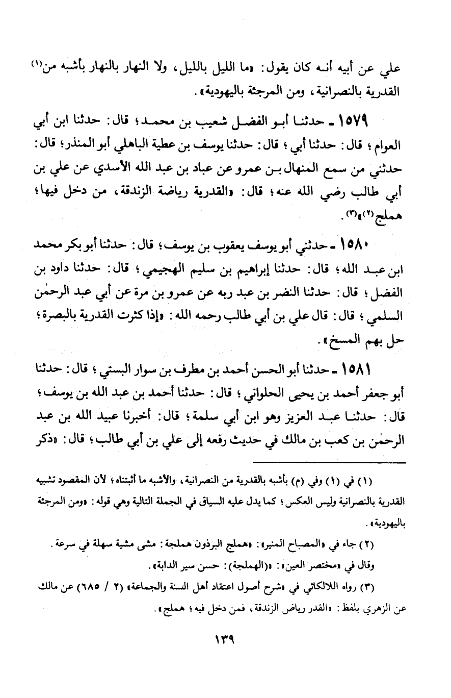 1580 - حَدَّثَنِي أَبُو يُوسُفَ يَعْقُوبُ بْنُ يُوسُفَ قَالَ: حَدَّثَنَا أَبُو بَكْرٍ مُحَمَّدُ بْنُ عَبْدِ اللَّهِ قَالَ: حَدَّثَنَا إِبْرَاهِيمُ بْنُ سُلَيْمٍ الْهُجَيْمِيُّ، قَالَ: حَدَّثَنَا دَاوُدُ بْنُ الْفَضْلِ، قَالَ: حَدَّثَنَا النَّضْرُ بْنُ عَبْدِ رَبِّهِ، عَنْ عَمْرِو بْنِ مُرَّةَ، عَنْ أَبِي عَبْدِ الرَّحْمَنِ السُّلَمِيِّ، قَالَ: قَالَ عَلِيُّ بْنُ أَبِي طَالِبٍ رَحِمَهُ اللَّهُ: § «إِذَا كَثُرَتِ الْقَدَرِيَّةُ بِالْبَصْرَةِ حَلَّ بِهِمُ الْمَسْخُ»
