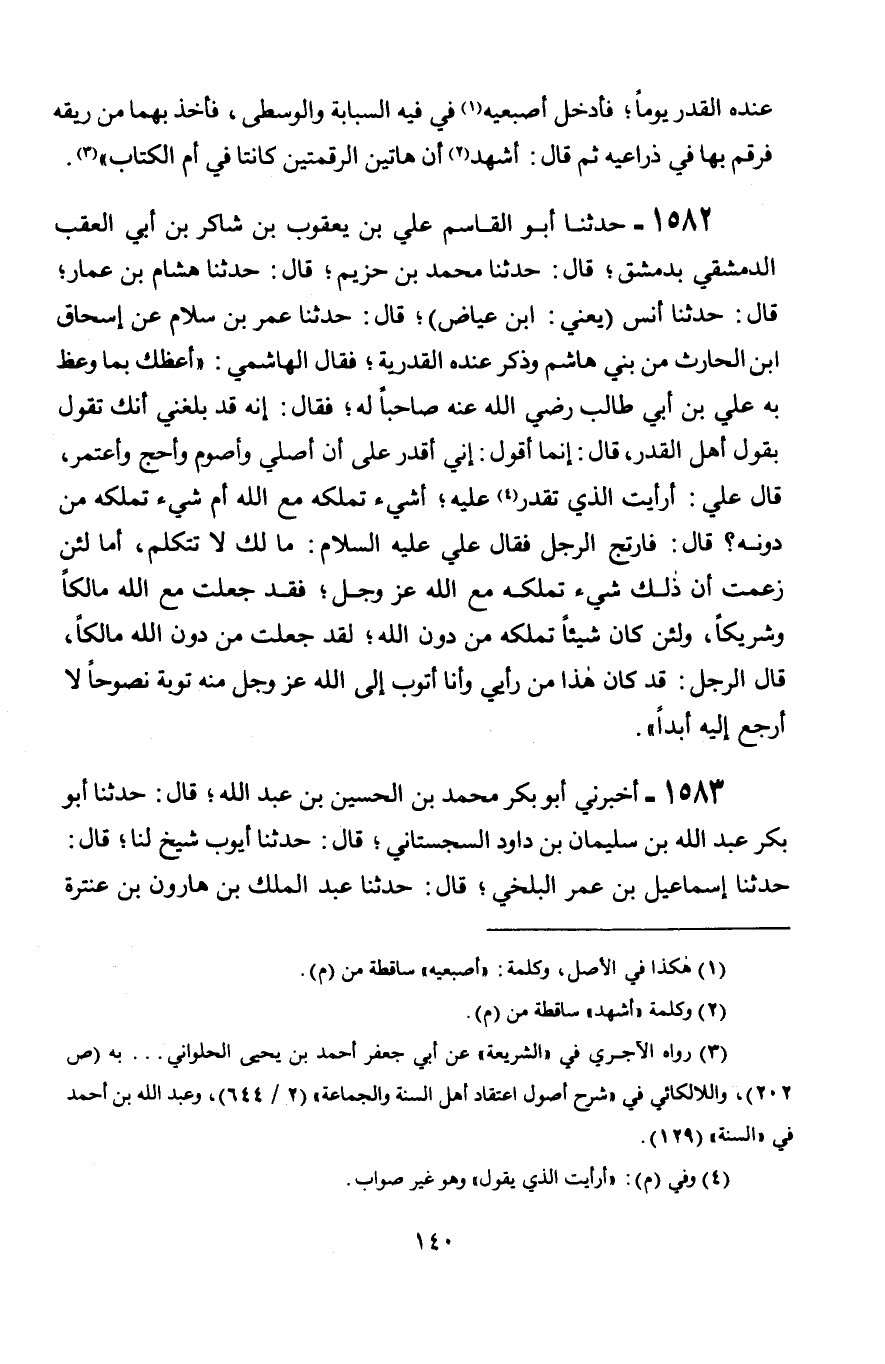 1582 - حَدَّثَنَا أَبُو الْقَاسِمِ عَلِيُّ بْنُ يَعْقُوبَ بْنِ شَاكِرِ بْنِ أَبِي الْعَقِبِ الدِّمَشْقِيُّ بِدِمَشْقَ قَالَ: حَدَّثَنَا مُحَمَّدُ بْنُ خُرَيْمٍ، قَالَ: حَدَّثَنَا هِشَامُ بْنُ عَمَّارٍ، قَالَ: حَدَّثَنَا أَنَسٌ يَعْنِي ابْنَ عِيَاضٍ، قَالَ: حَدَّثَنَا عُمَرُ بْنُ سَلَّامٍ، عَنْ إِسْحَاقَ بْنِ الْحَارِثِ، مِنْ بَنِي هَاشِمٍ، وَذُكِرَ عِنْدَهُ الْقَدَرِيَّةُ، فَقَالَ الْهَاشِمِيُّ، أَعِظُكَ بِمَا وَعَظَ بِهِ عَلِيُّ بْنُ أَبِي طَالِبٍ رَضِيَ اللَّهُ عَنْهُ صَاحِبًا لَهُ، فَقَالَ: إِنَّهُ قَدْ بَلَغَنِي أَنَّكَ تَقُولُ بِقَوْلِ أَهْلِ الْقَدَرِ، قَالَ: إِنَّمَا أَقُولُ: إِنِّي أَقْدِرُ عَلَى أَنْ أُصَلِّيَ وَأَصُومَ وَأَحُجَّ وَأَعْتَمِرَ، قَالَ عَلِيٌّ: أَرَأَيْتَ الَّذِيَ تَقْدِرُ عَلَيْهِ، أَشَيْءٌ تَمْلِكُهُ مَعَ اللَّهِ أَمْ شَيْءٌ تَمْلِكُهُ مِنْ دُونِهِ؟ قَالَ: فَارْتَجَّ الرَّجُلُ، فَقَالَ عَلِيٌّ عَلَيْهِ السَّلَامُ: مَا لَكَ لَا تَتَكَلَّمُ، أَمَا §لَئِنْ زَعَمْتَ أَنَّ ذَلِكَ شَيْءٌ تَمْلِكُهُ مَعَ اللَّهِ عَزَّ وَجَلَّ، فَقَدْ جَعَلْتَ مَعَ اللَّهِ مَالِكًا وَشَرِيكًا، وَلَئِنْ كَانَ شَيْئًا تَمْلِكُهُ مِنْ دُونَ اللَّهِ، لَقَدْ جَعَلْتَ مِنْ دُونِ اللَّهِ مَالِكًا، قَالَ الرَّجُلُ: قَدْ كَانَ هَذَا مِنْ رَأْيِي وَأَنَا أَتُوبُ إِلَى اللَّهِ عَزَّ وَجَلَّ مِنْهُ تَوْبَةً نَصُوحًا لَا أَرْجِعُ إِلَيْهِ أَبَدًا "