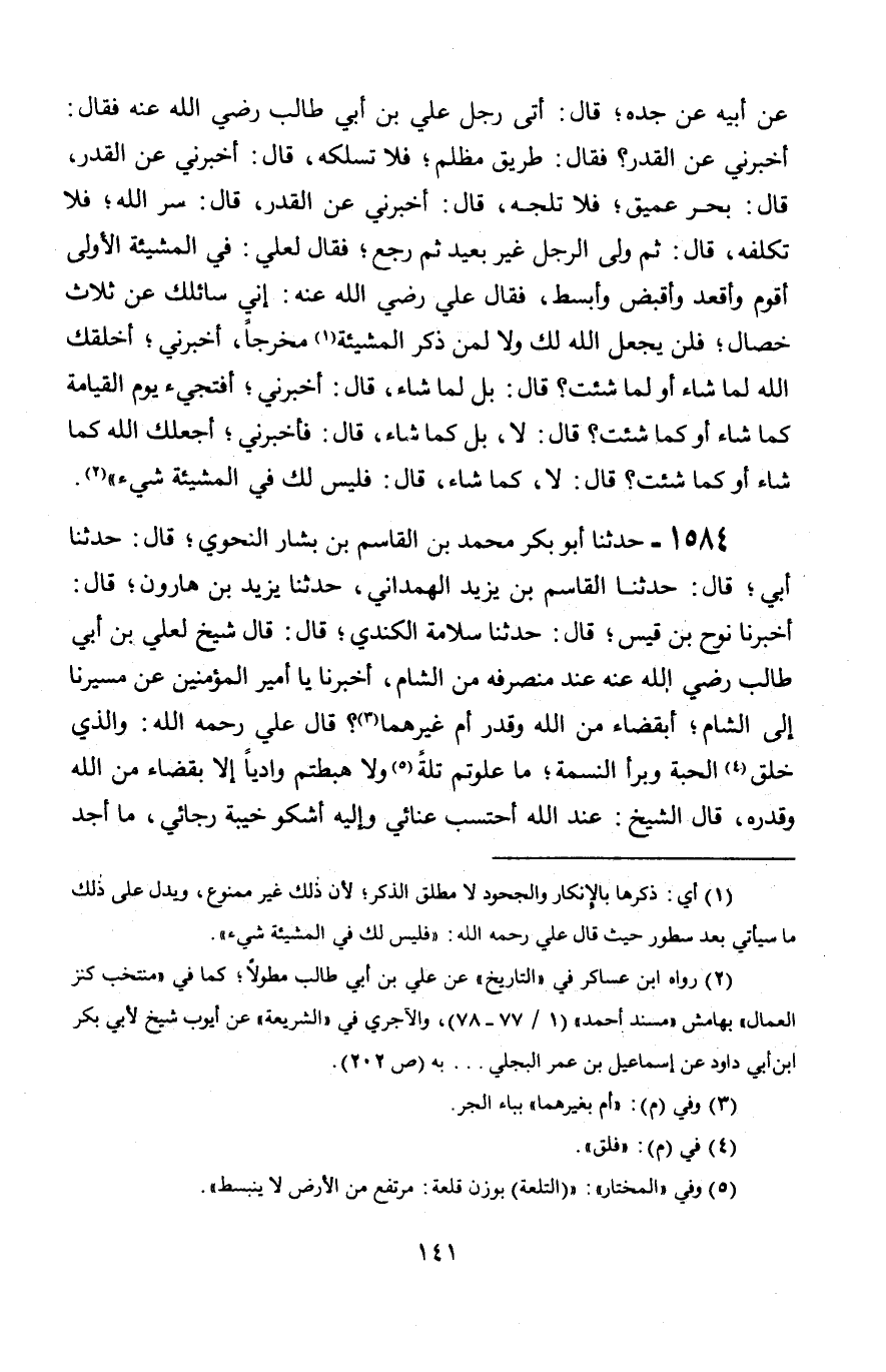 1584 - حَدَّثَنَا أَبُو بَكْرٍ مُحَمَّدُ بْنُ الْقَاسِمِ بْنِ بَشَّارٍ النَّحْوِيُّ قَالَ: حَدَّثَنَا أَبِي قَالَ: حَدَّثَنَا الْقَاسِمُ بْنُ يَزِيدَ الْهَمْدَانِيُّ، حَدَّثَنَا يَزِيدُ بْنُ هَارُونَ، قَالَ: أَخْبَرَنَا نُوحُ بْنُ قَيْسٍ، قَالَ: حَدَّثَنَا سَلَامَةُ الْكِنْدِيُّ، قَالَ: قَالَ شَيْخٌ لِعَلِيِّ بْنِ أَبِي طَالِبٍ رَضِيَ اللَّهُ عَنْهُ عِنْدَ مُنْصَرَفِهِ مِنَ الشَّامِ، أَخْبِرْنَا يَا أَمِيرَ الْمُؤْمِنِينَ عَنْ مَسِيرِنَا إِلَى الشَّامِ، أَبِقَضَاءٍ مِنَ اللَّهِ وَقَدَرٍ أَمْ غَيْرِهِمَا، قَالَ عَلِيٌّ رَحِمَهُ اللَّهُ: وَالَّذِي خَلَقَ الْحَبَّةَ وَبَرَأَ النَّسَمَةَ، §مَا عَلَوْتُمْ تَلَّةَ، وَلَا هَبَطْتُمْ وَادِيًا إِلَّا بِقَضَاءٍ مِنَ اللَّهِ وَقَدَرِهِ، قَالَ الشَّيْخُ: عِنْدَ اللَّهِ أَحْتَسِبُ عَنَائِي وَإِلَيْهِ أَشْكُو خَيْبَةَ رَجَائِي، مَا أَجِدُ -[142]- لِي مِنَ الْأَجْرِ شَيْئًا؟ قَالَ: بَلَى، قَدْ أَعْظَمَ اللَّهُ لَكُمُ الْأَجْرَ عَلَى مَسِيرِكُمْ وَأَنْتُمْ سَائِرُونَ وَعَلَى مَقَامِكُمْ وَأَنْتُمْ مُقِيمُونَ، وَمَا وَضَعْتُمْ قَدَمًا، وَلَا رَفَعْتُمْ أُخْرَى، إِلَّا وَقَدْ كَتَبَ اللَّهُ لَكُمْ أَجْرًا عَظِيمًا. قَالَ الشَّيْخُ: كَيْفَ يَا أَمِيرَ الْمُؤْمِنِينَ وَالْقَضَاءُ وَالْقَدَرُ سَاقَانَا وَعَنْهُمَا وَرَدْنَا وَصَدَرْنَا؟ فَقَالَ عَلِيٌّ رَضِيَ اللَّهُ عَنْهُ: أَيُّهَا الشَّيْخُ، لَعَلَّكَ ظَنَنْتَهُ قَضَاءً جَبْرًا وَقَدَرًا قَسْرًا، لَوْ كَانَ ذَلِكَ كَذَلِكَ لَبَطَلَ الْأَمْرُ وَالنَّهْيُ، وَالْوَعْدُ وَالْوَعِيدُ، وَبَطَلَ الثَّوَابُ وَالْعِقَابُ، وَلَمْ يَكُنِ الْمُحْسِنُ أَوْلَى بِمَثُوبَةِ الْإِحْسَانِ مِنَ الْمُسِيءِ، وَلَا الْمُسِيءُ أَوْلَى بِعُقُوبَةِ الْإِسَاءَةِ مِنَ الْمُحْسِنِ. قَالَ الشَّيْخُ: فَمَا الْقَضَاءُ وَالْقَدَرُ؟ قَالَ عَلِيٌّ: الْعِلْمُ السَّابِقُ فِي اللَّوْحِ الْمَحْفُوظِ وَالرَّقِّ الْمَنْثُورِ بِكُلِّ مَا كَانَ وَبِمَا هُوَ كَائِنٌ، وَبِتَوْفِيقِ اللَّهِ وَمَعُونَتِهِ لِمَنِ اجْتَبَاهُ بِوَلَايَتِهِ وَطَاعَتِهِ وَبِخُذْلَانِ اللَّهِ وَتَخَلِّيَّتِهِ لِمَنْ أَرَادَ لَهُ وَأَحَبَّ شَقَاهُ بِمَعْصِيَتِهِ وَمُخَالَفَتِهِ، فَلَا تَحْسَبَنَّ غَيْرَ ذَلِكَ فَتُوَافِقَ مَقَالَةَ الشَّيْطَانِ وَعَبْدَةَ الْأَوْثَانِ وَقَدَرِيَّةَ هَذِهِ الْأُمَّةِ وَمَجُوسَهَا، ثُمَّ إِنَّ اللَّهَ عَزَّ وَجَلَّ أَمَرَ تَحْذِيرًا وَنَهَى تَخْيِيرًا وَلَمْ يُطِعْ غَالِبًا وَلَمْ يَعْصِ مَغْلُوبًا، وَلَمْ يَكُ فِي الْخَلْقِ شَيْءٌ حَدَثَ فِي عِلْمِهِ، فَمَنْ أَحْسَنَ فَبِتَوْفِيقِ اللَّهِ وَرَحْمَتِهِ، وَمَنْ أَسَاءَ فَبِخُذْلَانِ اللَّهِ وَإِسَاءَتِهِ هَلَكَ، لَا الَّذِي أَحْسَنَ اسْتَغْنَى عَنْ تَوْفِيقِ اللَّهِ، وَلَا الَّذِي أَسَاءَ عَلَيْهِ وَلَا اسْتَبَدَّ بِشَيْءٍ يَخْرُجُ بِهِ عَنْ قُدْرَتِهِ، ثُمَّ لَمْ يُرْسِلِ الرُّسُلَ بَاطِلًا، وَلَمْ يُرِ الْآيَاتِ وَالْعَزَائِمَ عَبَثًا {ذَلِكَ ظَنُّ الَّذِينَ كَفَرُوا فَوَيْلٌ لِلَّذِينَ كَفَرُوا مِنَ النَّارِ} [ص: 27]