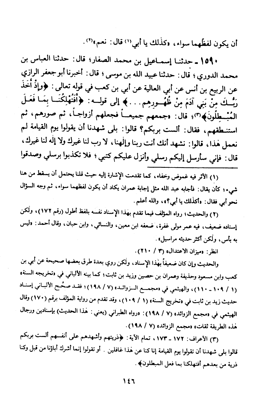 1590 - حَدَّثَنَا إِسْمَاعِيلُ بْنُ مُحَمَّدٍ الصَّفَّارُ، قَالَ: حَدَّثَنَا الْعَبَّاسُ بْنُ مُحَمَّدٍ الدُّورِيُّ، قَالَ: حَدَّثَنَا عُبَيْدُ اللَّهِ بْنُ مُوسَى، قَالَ: أَخْبَرَنَا أَبُو جَعْفَرٍ الرَّازِيُّ، عَنِ الرَّبِيعِ بْنِ أَنَسٍ، عَنْ أَبِي الْعَالِيَةِ، عَنْ أُبَيِّ بْنِ كَعْبٍ فِي قَوْلِهِ تَعَالَى {§وَإِذْ أَخَذَ رَبُّكَ مِنْ بَنِي آدَمَ مِنْ ظُهُورِهِمْ} [الأعراف: 172] إِلَى قَوْلِهِ {أَفَتُهْلِكُنَا بِمَا فَعَلَ الْمُبْطِلُونَ} [الأعراف: 173] قَالَ: " جَمَعَهُمْ جَمِيعًا فَجَعَلَهُمْ أَزْوَاجًا، ثُمَّ صَوَّرَهُمْ، ثُمَّ اسْتَنْطَقَهُمْ، فَقَالَ: أَلَسْتُ بِرَبِّكُمْ؟ قَالُوا: بَلَى شَهِدْنَا أَنْ يَقُولُوا يَوْمَ الْقِيَامَةِ: لَمْ نَعْمَلْ هَذَا، قَالُوا: نَشْهَدُ أَنَّكَ أَنْتَ رَبُّنَا وَإِلَهُنَا، لَا رَبَّ غَيْرُكَ وَلَا إِلَهَ لَنَا غَيْرُكَ قَالَ: فَإِنِّي سَأُرْسِلُ إِلَيْكُمْ رُسُلِي وَأُنْزِلُ عَلَيْكُمْ كُتُبِي، فَلَا تُكَذِّبُوا بِرُسُلِي وَصَدِّقُوا -[147]- بِوَعْدِي، إِنِّي سَأَنْتَقِمُ مِمَّنْ أَشْرَكَ بِي وَلَمْ يُؤْمِنْ بِي قَالَ: فَأَخَذَ عَهْدَهُمْ وَمِيثَاقَهُمْ ثُمَّ رَفَعَ أَبَاهُمْ آدَمَ إِلَيْهِمْ فَنَظَرَ إِلَيْهِمْ، فَرَأَى مِنْهُمُ الْغَنِيَّ وَالْفَقِيرَ وَحَسَنَ الصُّورَةِ وَدُونَ ذَلِكَ، فَقَالَ: رَبِّ لَوْ شِئْتَ سَوَّيْتَ بَيْنَ عِبَادِكَ قَالَ: إِنِّي أَحْبَبْتُ أَنْ أُشْكَرَ، وَالْأَنْبِيَاءُ يَوْمَئِذٍ فِيهِمْ مِثْلُ السُّرُجِ قَالَ: وَخُصُّوا بِمِيثَاقٍ آخَرَ لِلرِّسَالَةِ أَنْ يُبَلِّغُوهَا قَالَ: فَهُوَ قَوْلُهُ: {وَإِذْ أَخَذْنَا مِنَ النَّبِيِّينَ مِيثَاقَهُمْ وَمِنْكَ وَمِنْ نُوحٍ} [الأحزاب: 7] قَالَ: " وَهُوَ قَوْلُهُ: {فِطْرَةَ اللَّهِ الَّتِي فَطَرَ النَّاسَ عَلَيْهَا} [الروم: 30] وَهُوَ قَوْلُهُ {وَمَا وَجَدْنَا لِأَكْثَرِهِمْ مِنْ عَهْدٍ وَإِنْ وَجَدْنَا أَكْثَرَهُمْ لَفَاسِقِينَ} [الأعراف: 102] قَالَ: " وَذَلِكَ قَوْلُهُ {وَاذْكُرُوا نِعْمَةَ اللَّهِ عَلَيْكُمْ وَمِيثَاقَهُ الَّذِي وَاثَقَكُمْ بِهِ} [المائدة: 7] قَالَ: " فَكَانَ فِي عِلْمِ اللَّهِ يَوْمَئِذٍ مَنْ يُكَذِّبُهُ وَمَنْ يُصَدِّقُهُ قَالَ: وَكَانَ رُوحُ عِيسَى ابْنُ مَرْيَمَ عَلَيْهِ السَّلَامُ فِي تِلْكَ الْأَرْوَاحِ الَّتِي أَخَذَهَا عَهْدَهَا وَمِيثَاقَهَا فِي زَمَنِ آدَمَ قَالَ: فَأَرْسَلَهُ اللَّهُ عَزَّ وَجَلَّ فِي صُورَةِ بَشَرٍ إِلَى مَرْيَمَ {فَتَمَثَّلَ لَهَا بَشَرًا سَوِيًّا} [مريم: 17]، {قَالَتْ أَنَّى يَكُونُ لِي غُلَامٌ وَلَمْ يَمْسَسْنِي بَشَرٌ وَلَمْ أَكُ بَغِيًّا} [مريم: 20] قَالَ: " فَحَمَلَتِ الَّذِي يُخَاطِبُهَا قَالَ: أَيْ دَخَلَ مِنْ فِيهَا