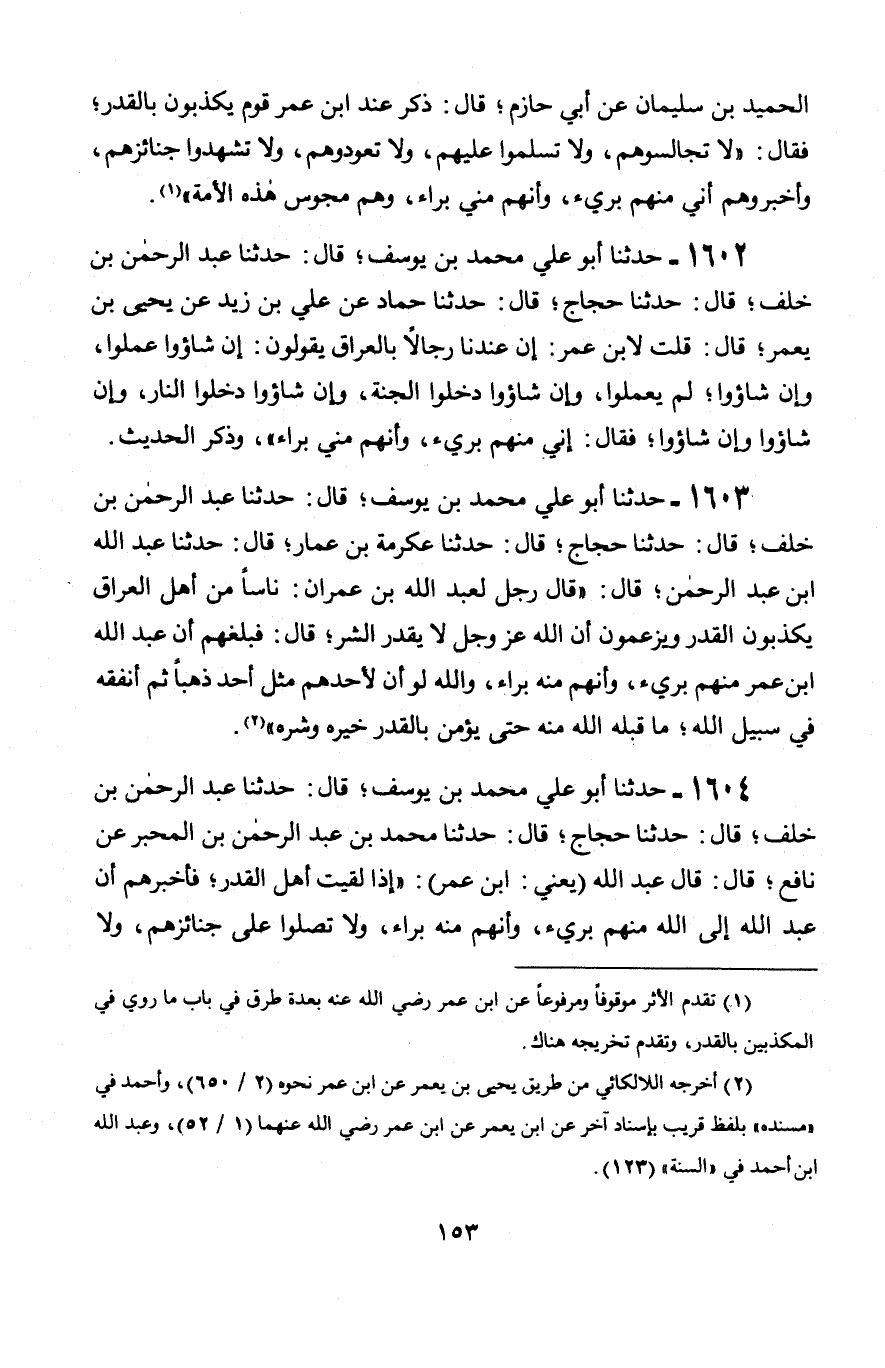 1602 - حَدَّثَنَا أَبُو عَلِيٍّ مُحَمَّدُ بْنُ يُوسُفَ قَالَ: حَدَّثَنَا عَبْدُ الرَّحْمَنِ بْنُ خَلَفٍ، قَالَ: حَدَّثَنَا حَجَّاجٌ، قَالَ: حَدَّثَنَا حَمَّادٌ عَنْ عَلِيِّ بْنِ زَيْدٍ، عَنْ يَحْيَى بْنِ يَعْمَرَ، قَالَ: قُلْتُ لِابْنِ عُمَرَ: إِنَّ عِنْدَنَا رِجَالًا بِالْعِرَاقِ يَقُولُونَ: إِنْ شَاءُوا عَمِلُوا، وَإِنْ شَاءُوا لَمْ يَعْمَلُوا، وَإِنْ شَاءُوا دَخَلُوا الْجَنَّةَ، وَإِنْ شَاءُوا دَخَلُوا النَّارَ، وَإِنْ شَاءُوا وَإِنْ شَاءُوا، فَقَالَ: «§إِنِّي مِنْهُمْ بَرِيءٌ، وَإِنَّهُمْ مِنِّي بَرَاءٌ». وَذَكَرَ الْحَدِيثَ