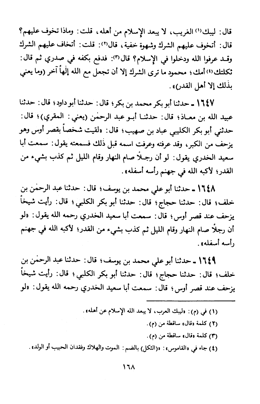 1649 - حَدَّثَنَا أَبُو عَلِيٍّ مُحَمَّد بْنُ يُوسُفَ قَالَ: حَدَّثَنَا عَبْدُ الرَّحْمَنِ بْنُ خَلَفٍ، قَالَ: حَدَّثَنَا أَبُو بَكْرٍ الْكَلْبِيُّ، قَالَ: رَأَيْتُ شَيْخًا يَزْحَفُ عِنْدَ قَصْرِ أَوْسٍ قَالَ: سَمِعْتُ أَبَا سَعِيدٍ الْخُدْرِيَّ رَحِمَهُ اللَّهُ يَقُولُ: «§لَوْ -[169]- أَنَّ عَبْدًا قَامَ اللَّيْلَ وَصَامَ النَّهَارَ، ثُمَّ كَذَّبَ بِشَيْءٍ مِنْ قَدَرِ اللَّهِ، لَأَكَبَّهُ اللَّهُ فِي النَّارِ، أَسْفَلُهُ أَعْلَاهُ» قَالَ: قُلْتُ لَهُ: أَنْتَ سَمِعْتَهُ مِنْ أَبِي سَعِيدٍ؟ قَالَ: أَنَا سَمِعْتُهُ مِنْ أَبِي سَعِيدٍ رَحِمَهُ اللَّهُ