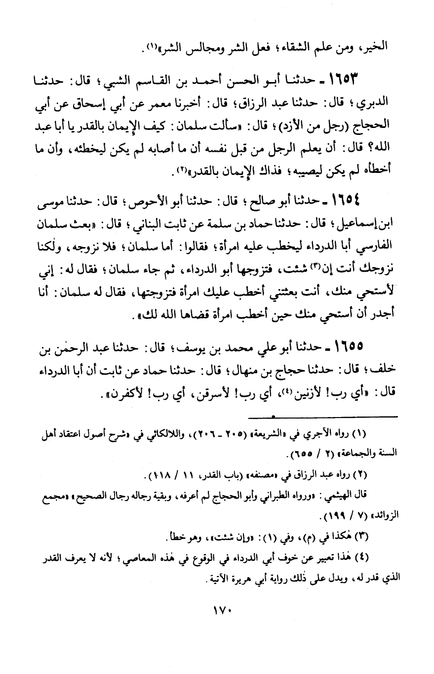 1653 - حَدَّثَنَا أَبُو الْحَسَنِ أَحْمَدُ بْنُ الْقَاسِمِ الشَّبِّيُّ قَالَ: حَدَّثَنَا الدَّبَرِيُّ، قَالَ: حَدَّثَنَا عَبْدُ الرَّزَّاقِ، قَالَ: أَخْبَرَنَا مَعْمَرٌ، عَنْ أَبِي إِسْحَاقَ، عَنْ أَبِي الْحَجَّاجِ رَجُلٍ مِنَ الْأَزْدِ، قَالَ: سَأَلْتُ سَلْمَانَ: §كَيْفَ الْإِيمَانُ بِالْقَدَرِ يَا أَبَا عَبْدِ اللَّهِ؟ قَالَ: أَنْ يَعْلَمَ الرَّجُلُ مِنْ قِبَلِ نَفْسِهِ أَنَّ مَا أَصَابَهُ لَمْ يَكُنْ لِيُخْطِئَهُ، وَأَنَّ مَا أَخْطَأَهُ لَمْ يَكُنْ لِيُصِيبَهُ، فَذَاكَ الْإِيمَانُ بِالْقَدَرِ