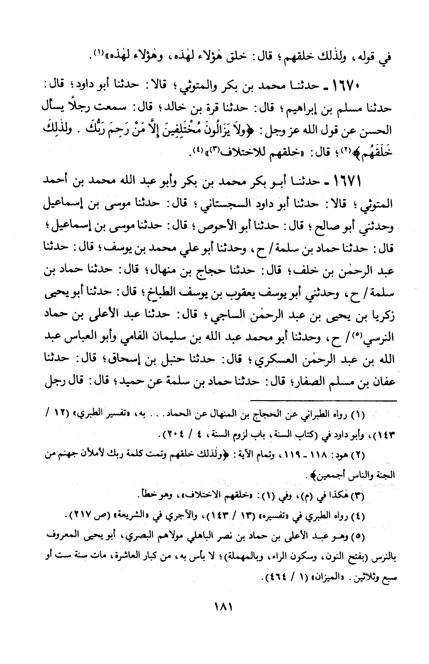1670 - حَدَّثَنَا مُحَمَّدُ بْنُ بَكْرٍ، وَالْمَتُّوثِيُّ، قَالَا: حَدَّثَنَا أَبُو دَاوُدَ، قَالَ: حَدَّثَنَا مُسْلِمُ بْنُ إِبْرَاهِيمَ، قَالَ: حَدَّثَنَا قُرَّةُ بْنُ خَالِدٍ، قَالَ: سَمِعْتُ رَجُلًا، يَسْأَلُ الْحَسَنَ عَنْ قَوْلِ اللَّهِ عَزَّ وَجَلَّ {§وَلَا يَزَالُونَ مُخْتَلِفِينَ إِلَّا مَنْ رَحِمَ رَبُّكَ وَلِذَلِكَ خَلَقَهُمْ} [هود: 119] قَالَ: " خَلَقَهُمْ لِلْاخْتِلَافِ