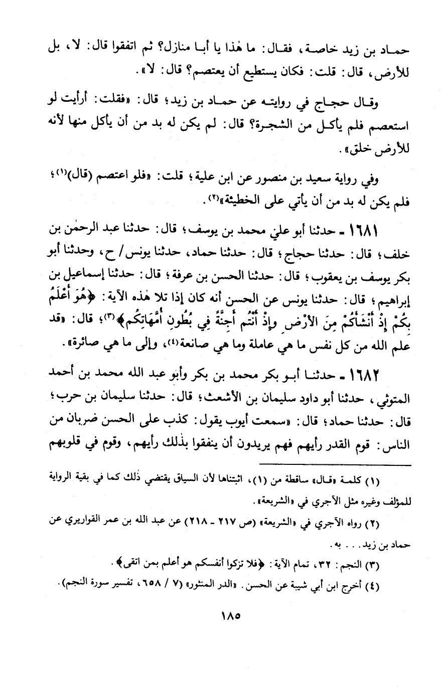 1681 - حَدَّثَنَا أَبُو عَلِيٍّ مُحَمَّد بْنُ يُوسُفَ قَالَ: حَدَّثَنَا عَبْدُ الرَّحْمَنِ بْنُ خَلَفٍ، قَالَ: حَدَّثَنَا حَجَّاجٌ، قَالَ: حَدَّثَنَا حَمَّادٌ، حَدَّثَنَا يُونُسُ، ح، وَحَدَّثَنَا أَبُو بَكْرٍ يُوسُفُ بْنُ يَعْقُوبَ قَالَ: حَدَّثَنَا الْحَسَنُ بْنُ عَرَفَةَ، قَالَ: حَدَّثَنَا إِسْمَاعِيلُ بْنُ إِبْرَاهِيمَ، قَالَ: حَدَّثَنَا يُونُسُ، عَنِ الْحَسَنِ، أَنَّهُ كَانَ إِذَا تَلَا هَذِهِ الْآيَةَ {§هُوَ أَعْلَمُ بِكُمْ إِذْ أَنْشَأَكُمْ مِنَ الْأَرْضِ وَإِذْ أَنْتُمْ أَجِنَّةٌ فِي بُطُونِ أُمَّهَاتِكُمْ} [النجم: 32] قَالَ: " قَدْ عَلِمَ اللَّهُ مِنْ كُلِّ نَفْسٍ مَا هِيَ عَامِلَةٌ وَمَا هِيَ صَانِعَةٌ وَإِلَى مَا هِيَ صَائِرَةٌ