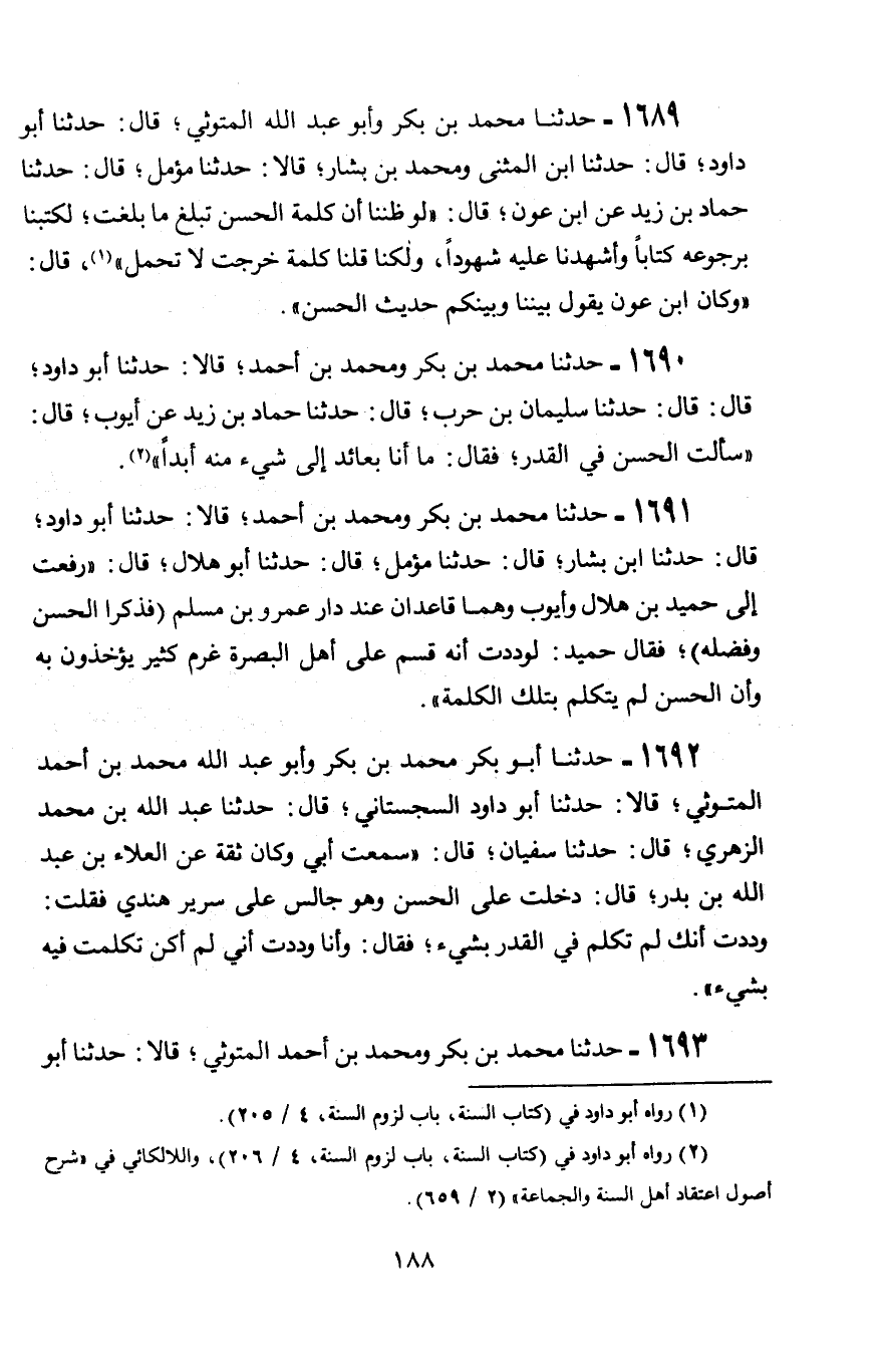 1689 - حَدَّثَنَا مُحَمَّدُ بْنُ بَكْرٍ، وَأَبُو عَبْدِ اللَّهِ الْمَتُّوثِيُّ، قَالَ: حَدَّثَنَا أَبُو دَاوُدَ، قَالَ: حَدَّثَنَا ابْنُ الْمُثَنَّى، وَمُحَمَّدُ بْنُ بَشَّارٍ، قَالَا: حَدَّثَنَا مُؤَمَّلٌ، قَالَ: حَدَّثَنَا حَمَّادُ بْنُ زَيْدٍ، عَنِ ابْنِ عَوْنٍ، قَالَ: §لَوْ ظَنَنَّا أَنَّ كَلِمَةَ الْحَسَنِ تَبْلُغُ مَا بَلَغَتْ، لَكَتَبْنَا بِرُجُوعِهِ كِتَابًا وَأَشْهَدْنَا عَلَيْهِ شُهُودًا، وَلَكِنَّا قُلْنَا كَلِمَةً خَرَجَتْ لَا تَحْمِلُ، قَالَ: وَكَانَ ابْنُ عَوْنٍ يَقُولُ: بَيْنَنَا وَبَيْنَكُمْ حَدِيثُ الْحَسَنِ