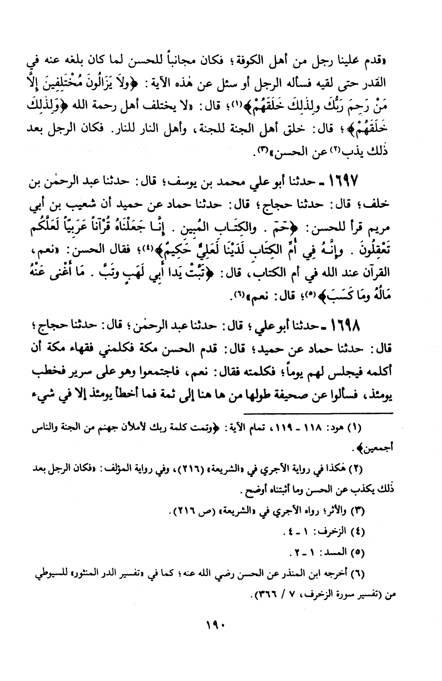 1697 - حَدَّثَنَا أَبُو عَلِيٍّ مُحَمَّدُ بْنُ يُوسُفَ قَالَ: حَدَّثَنَا عَبْدُ الرَّحْمَنِ بْنُ خَلَفٍ، قَالَ: حَدَّثَنَا حَجَّاجٌ، قَالَ: حَدَّثَنَا حَمَّادٌ، عَنْ حُمَيْدٍ، أَنَّ شُعَيْبَ بْنَ أَبِي مَرْيَمَ، قَرَأَ لِلْحَسَنِ {§حم وَالْكِتَابِ الْمُبِينِ إِنَّا جَعَلْنَاهُ قُرْآنًا عَرَبِيًّا لَعَلَّكُمْ تَعْقِلُونَ وَإِنَّهُ فِي أُمِّ الْكِتَابِ لَدَيْنَا لِعَلِيٌّ حَكِيمٌ} [الزخرف: 2] فَقَالَ الْحَسَنُ: نَعَمْ، الْقُرْآنُ عِنْدَ اللَّهِ فِي أُمِّ الْكِتَابِ، قَالَ {تَبَّتْ يَدَا أَبِي لَهَبٍ وَتَبَّ مَا أَغْنَى عَنْهُ مَالُهُ وَمَا كَسْبَ} [المسد: 1] قَالَ: «نَعَمْ»