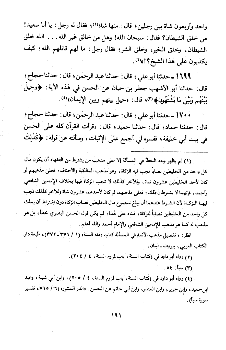 1700 - حَدَّثَنَا أَبُو عَلِيٍّ، قَالَ: حَدَّثَنَا عَبْدُ الرَّحْمَنِ، قَالَ: حَدَّثَنَا حَجَّاجٌ، قَالَ: حَدَّثَنَا حَمَّادٌ، قَالَ: حَدَّثَنَا حُمَيْدٌ، قَالَ: قَرَأْتُ الْقُرْآنَ كُلَّهُ عَلَى الْحَسَنِ فِي بَيْتِ أَبِي خَلِيفَةَ، فَفَسَّرَهُ لِي أَجْمَعَ عَلَى الْإِثْبَاتِ، وَسَأَلْتُهُ عَنْ قَوْلِهِ {§كَذَلِكَ -[192]- سَلَكْنَاهُ فِي قُلُوبِ الْمُجْرِمِينَ} [الشعراء: 200] قَالَ: " الشِّرْكُ سَكَلَهُ فِي قُلُوبِهِمْ، وَسَأَلْتُهُ عَنْ قَوْلِهِ {وَلَهُمْ أَعْمَالٌ مِنْ دُونِ ذَلِكَ هُمْ لَهَا عَامِلُونَ} [المؤمنون: 63] قَالَ: " أَعْمَالٌ سَيَعْمَلُونَهَا لَمْ يَعْمَلُوهَا بَعْدُ، وَسَأَلْتُهُ عَنْ قَوْلِهِ {مَا أَنْتُمْ عَلَيْهِ بِفَاتِنِينَ إِلَّا مَنْ هُوَ صَالِ الْجَحِيمِ} [الصافات: 163] قَالَ: «مَا أَنْتُمْ عَلَيْهِ بِمُضِلِّينَ إِلَّا مَنْ هُوَ صَالِ الْجَحِيمِ»