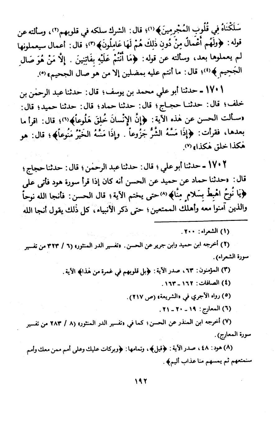 1702 - حَدَّثَنَا أَبُو عَلِيٍّ، قَالَ: حَدَّثَنَا عَبْدُ الرَّحْمَنِ، قَالَ: حَدَّثَنَا حَجَّاجٌ، قَالَ: حَدَّثَنَا حَمَّادٌ، عَنْ حُمَيْدٍ، عَنِ الْحَسَنِ، أَنَّهُ كَانَ إِذَا قَرَأَ سُورَةَ هُودٍ فَأَتَى عَلَى {§يَا نُوحُ اهْبِطْ بِسَلَامٍ مِنَّا} [هود: 48] حَتَّى يَخْتِمَ الْآيَةَ، قَالَ الْحَسَنُ: فَأَنْجَا اللَّهُ نُوحًا وَالَّذِينَ آمَنُوا مَعَهُ وَأَهْلَكَ الْمُمَتَّعِينَ، حَتَّى ذَكَرَ الْأَنْبِيَاءَ، كُلَّ ذَلِكَ يَقُولُ: أَنْجَا اللَّهُ -[193]- فُلَانًا، أَنْجَا اللَّهُ فُلَانًا، وَأَهْلَكَ الْمُمَتَّعِينَ "