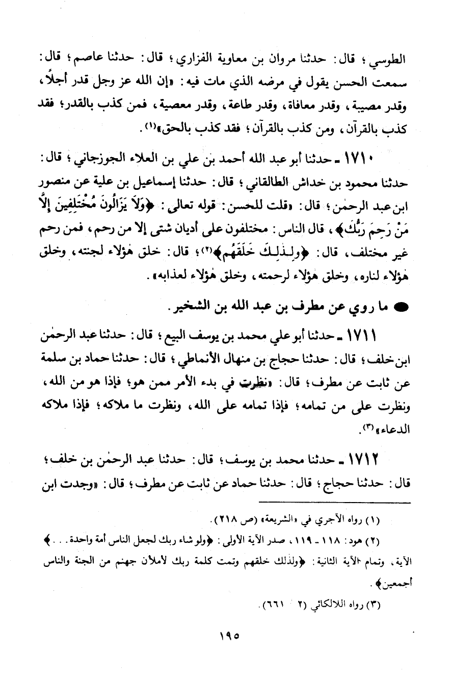 1711 - حَدَّثَنَا أَبُو عَلِيٍّ مُحَمَّد بْنُ يُوسُفَ الْبَيَّعُ قَالَ: حَدَّثَنَا عَبْدُ الرَّحْمَنِ بْنُ خَلَفٍ، قَالَ: حَدَّثَنَا حَجَّاجُ بْنُ مِنْهَالٍ الْأَنْمَاطِيُّ، قَالَ: حَدَّثَنَا حَمَّادُ بْنُ سَلَمَةَ، عَنْ ثَابِتٍ، عَنْ مُطَرِّفٍ، قَالَ: «§نَظَرْتُ فِي بَدْءِ الْأَمْرِ مِمَّنْ هُوَ، فَإِذَا هُوَ مِنَ اللَّهِ، وَنَظَرْتُ عَلَى مَنْ تَمَامُهُ، فَإِذَا تَمَامُهُ عَلَى اللَّهِ، وَنَظَرْتُ مَا مِلَاكُهُ، فَإِذَا مِلَاكُهُ الدُّعَاءُ»