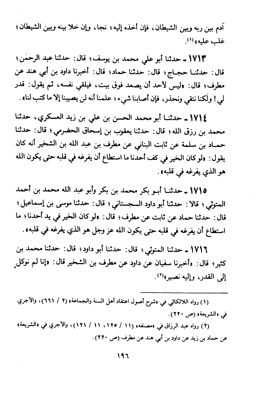 1715 - حَدَّثَنَا أَبُو بَكْرٍ مُحَمَّد بْنُ بَكْرٍ، وَأَبُو عَبْدِ اللَّهِ مُحَمَّدُ بْنُ أَحْمَدَ الْمَتُّوثِيُّ قَالَا: حَدَّثَنَا أَبُو دَاوُدَ السِّجِسْتَانِيُّ، قَالَ: حَدَّثَنَا مُوسَى بْنُ إِسْمَاعِيلَ، قَالَ: حَدَّثَنَا حَمَّادٌ، عَنْ ثَابِتٍ، عَنْ مُطَرِّفٍ، قَالَ: «§لَوْ كَانَ الْخَيْرُ فِي يَدِ أَحَدِنَا، مَا اسْتَطَاعَ أَنْ يُفْرِغَهُ فِي قَلْبِهِ حَتَّى يَكُونَ اللَّهُ عَزَّ وَجَلَّ هُوَ الَّذِي يُفْرِغُهُ فِي قَلْبِهِ»