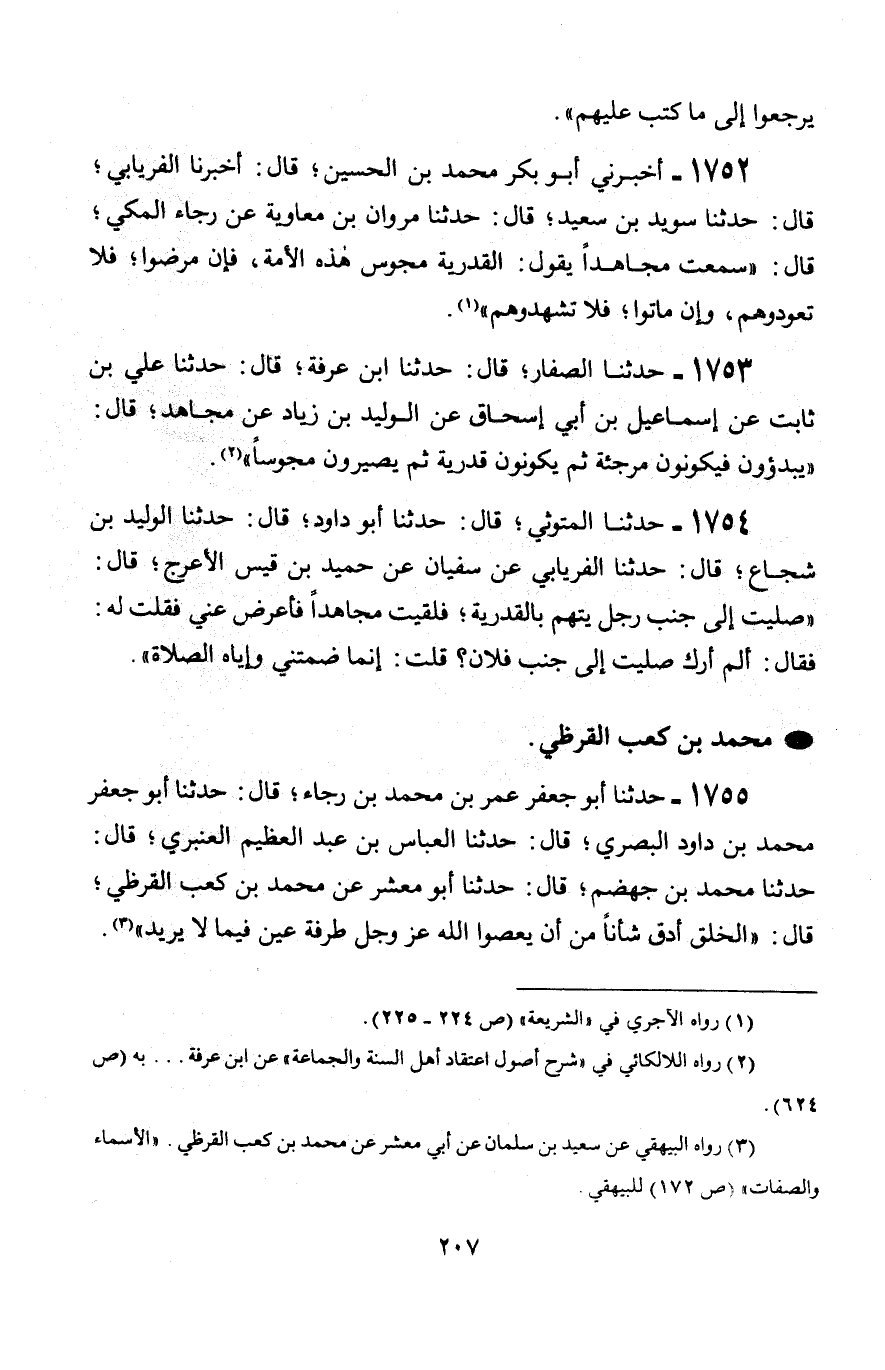 1752 - أَخْبَرَنِي أَبُو بَكْرٍ مُحَمَّد بْنُ الْحُسَيْنِ قَالَ: أَخْبَرَنَا الْفِرْيَابِيُّ، قَالَ: حَدَّثَنَا سُوَيْدُ بْنُ سَعِيدٍ، قَالَ: حَدَّثَنَا مَرْوَانُ بْنُ مُعَاوِيَةَ، عَنْ رَجَاءٍ الْمَكِّيِّ، قَالَ: سَمِعْتُ مُجَاهِدًا، يَقُولُ: §الْقَدَرِيَّةُ مَجُوسُ هَذِهِ الْأُمَّةِ فَإِنْ مَرِضُوا فَلَا تَعُودُوهُمْ، وَإِنْ مَاتُوا فَلَا تَشْهَدُوهُمْ "